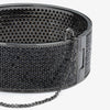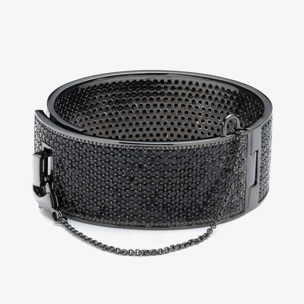 The Pavé Safety Chain Cuff, finished in Blackened Silver and set with hand cut jet pavé crystals. This unique Eddie Borgo bracelet brings a dark romance to one of our most coveted pieces. Secure the bracelet by attaching the safety chain closure. This signature bracelet can be worn with the chain draping down either the front or the back of the wrist.