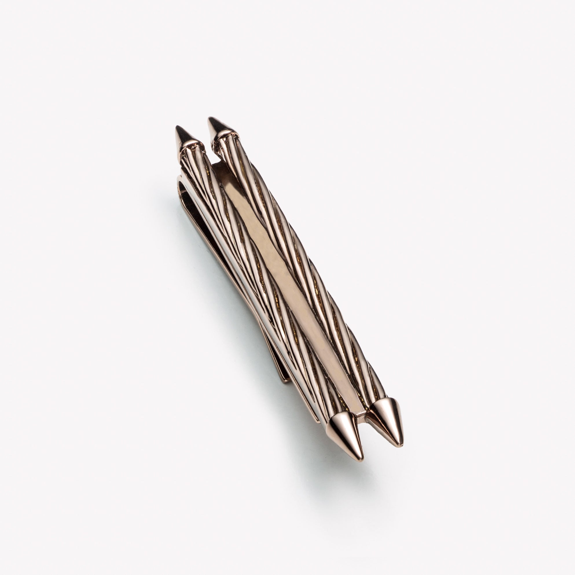 THE TENSION CABLE TIE CLIP IS A STERLING SILVER, SLIDE ON TIE CLIP, CREATED FROM TWO HANDMADE BARS OF TWISTED CABLE WIRE AND CAPPED WITH THE BRAND'S SIGNATURE CONICAL SHAPES. FINISHED IN A CHOCOLATE BROWN VERMEIL, A CUSTOM FINISH CREATED BY THE EDDIE BORGO STUDIO.
