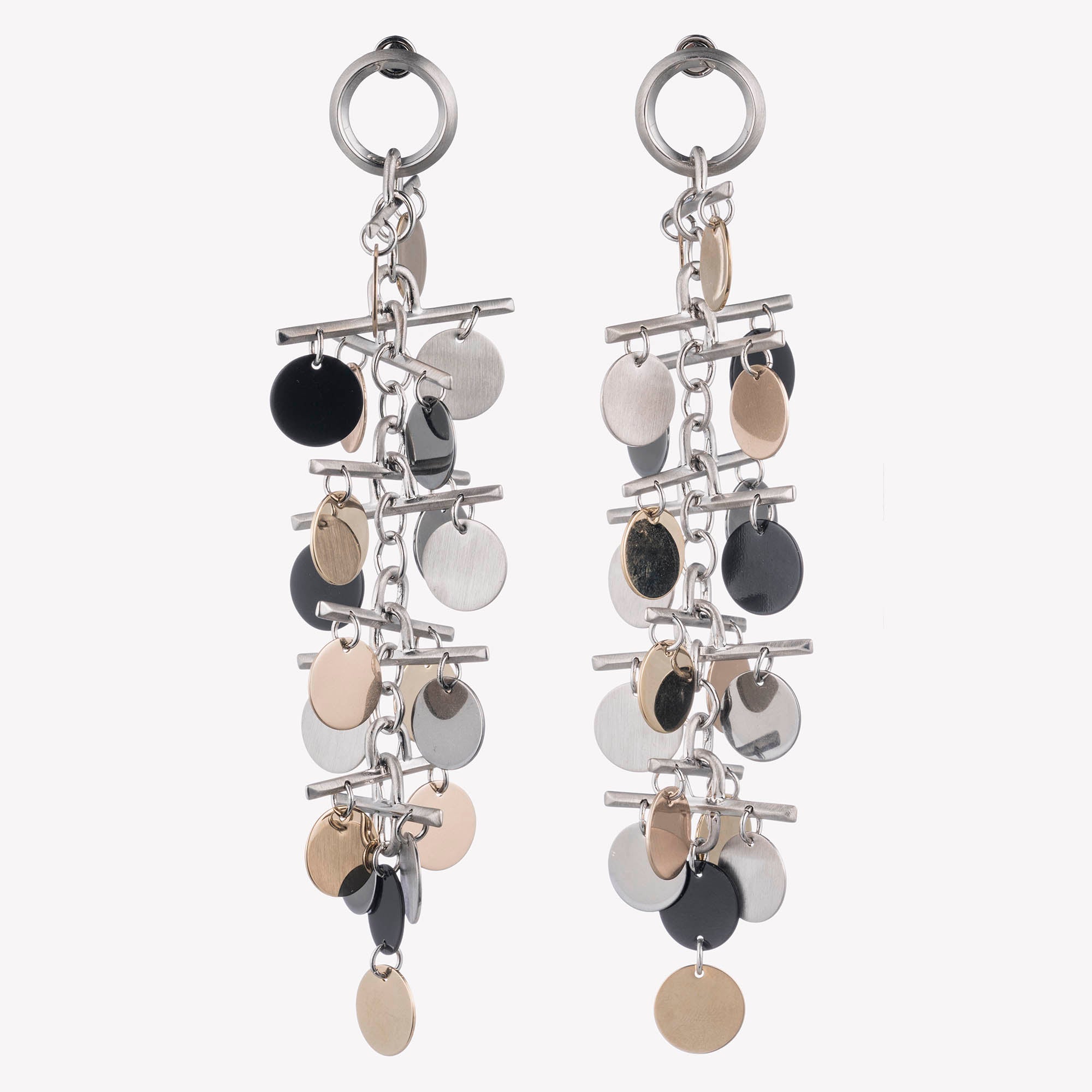 The Paillette Mobile Earrings are reimagined here in a combination of finishes in 12 Karat Gold, brushed Rose Gold, oxidized Silver, and brushed Silver. These truly unique earrings are a linear mobile structure, hung with delicate disks that gently move with the wearer. Wear this earring as a single or a pair.