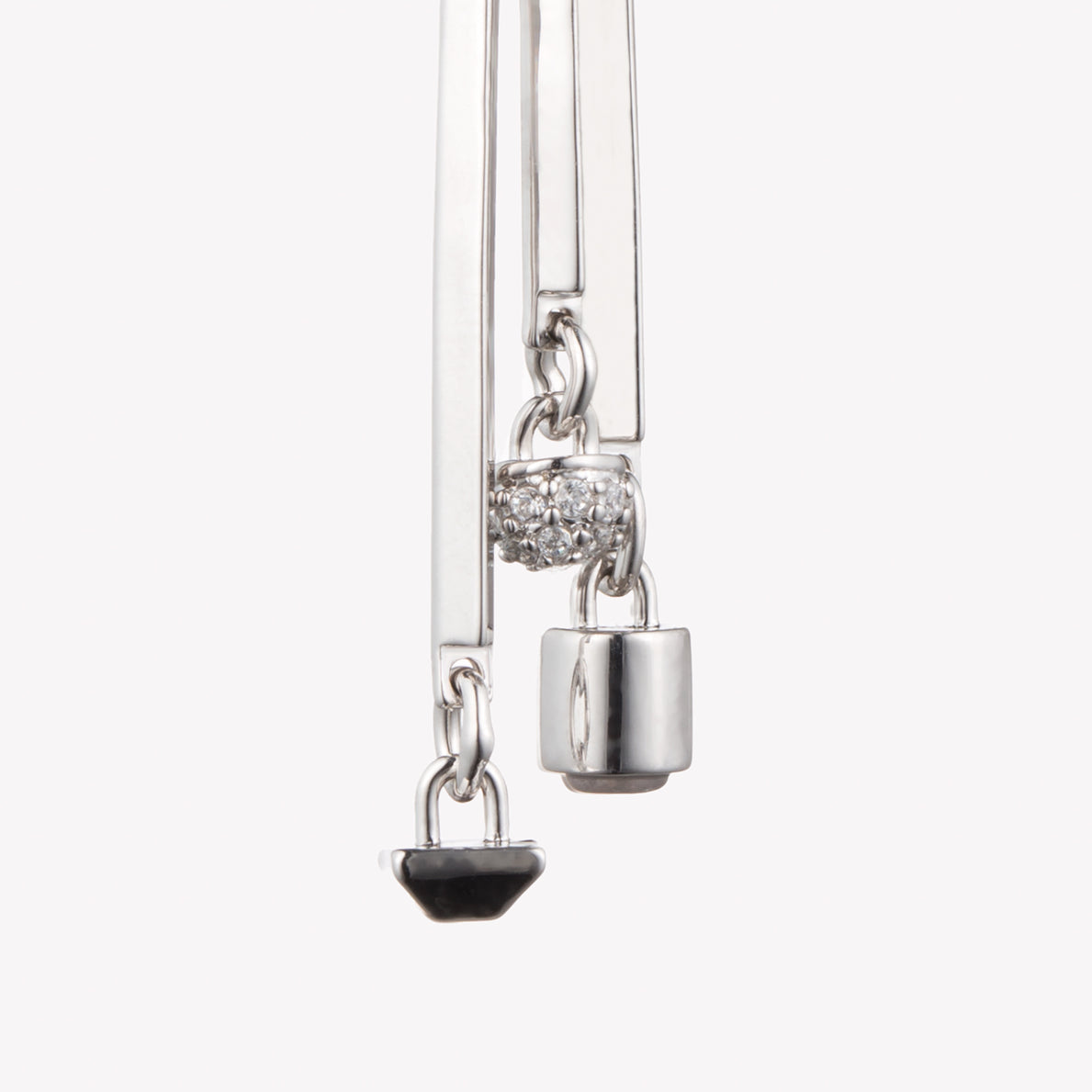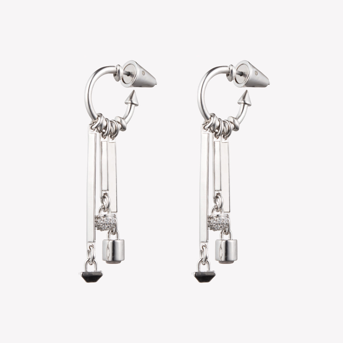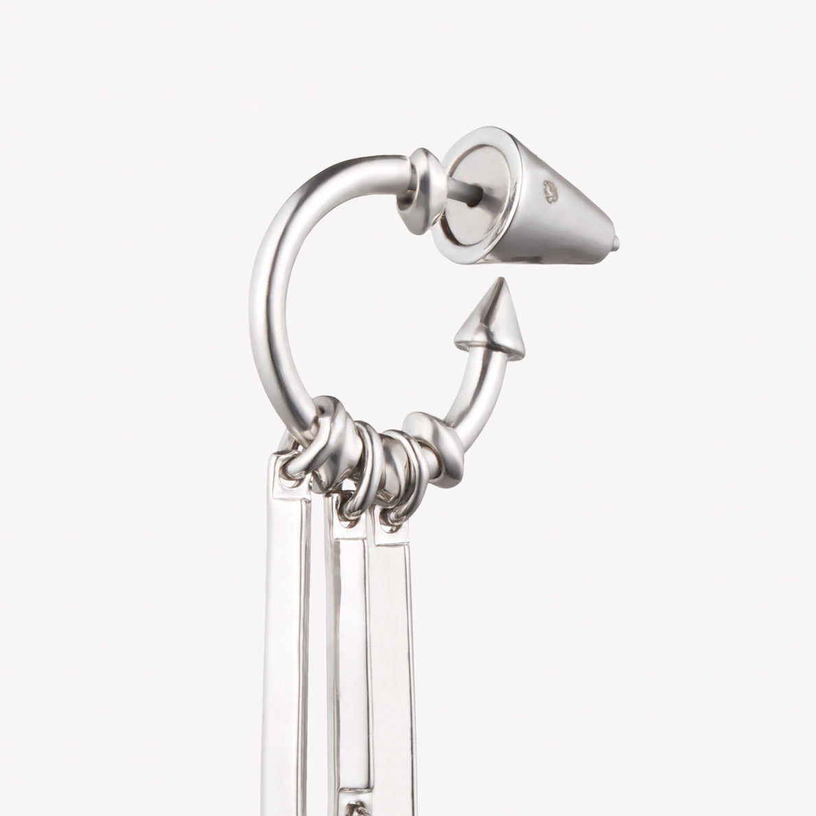 The Charm Hoop Earrings, finished in Silver, have been hung with delicate rods, ending in charm shapes of a truncated pyramid, a dome, and a cylinder. The dome has been handset in pavé, while the cylinder has been inlaid with rose quartz. Secure to ear with a custom Eddie Borgo earring backing. Surgical steel post, for pierced ears.