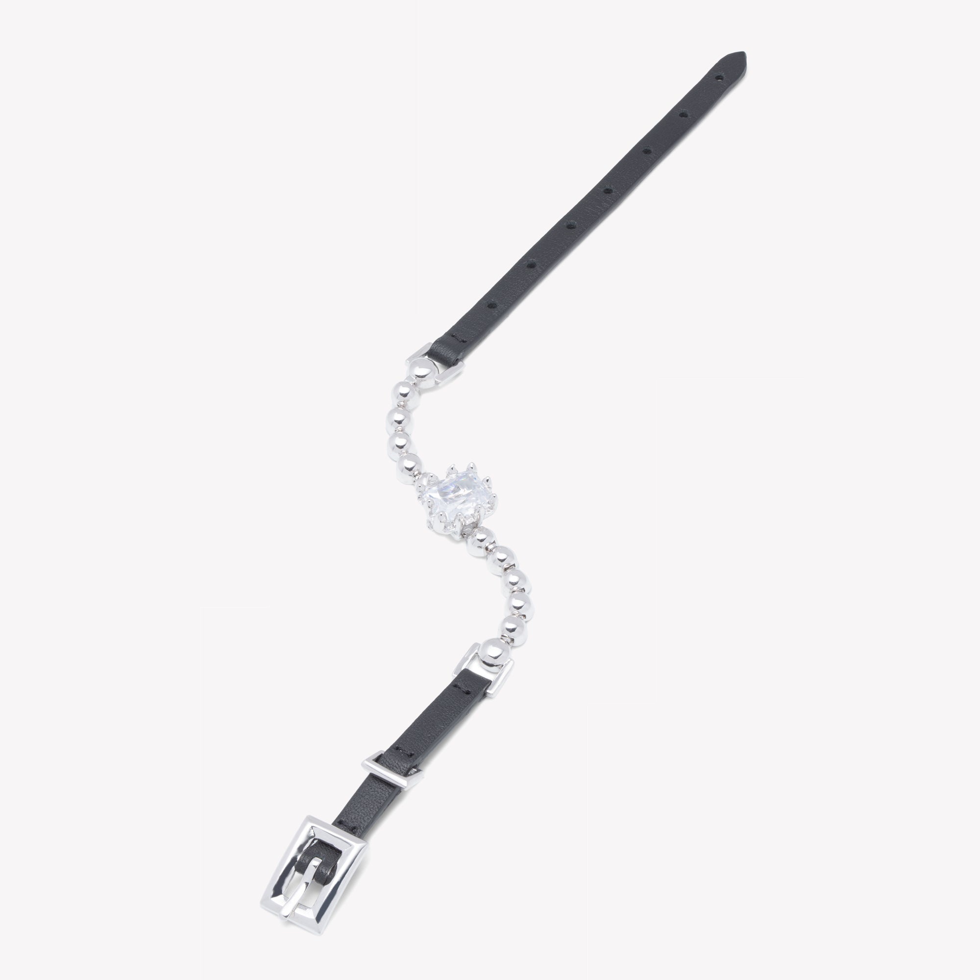 The Estate Strap Bracelet combines the fluidity of our classic Dome Tennis Bracelet with a clean black leather strap. A central, emerald cut crystal has been step cut and set in our custom prongs. Finished in silver. Closes with an adjustable leather strap and buckle closure.