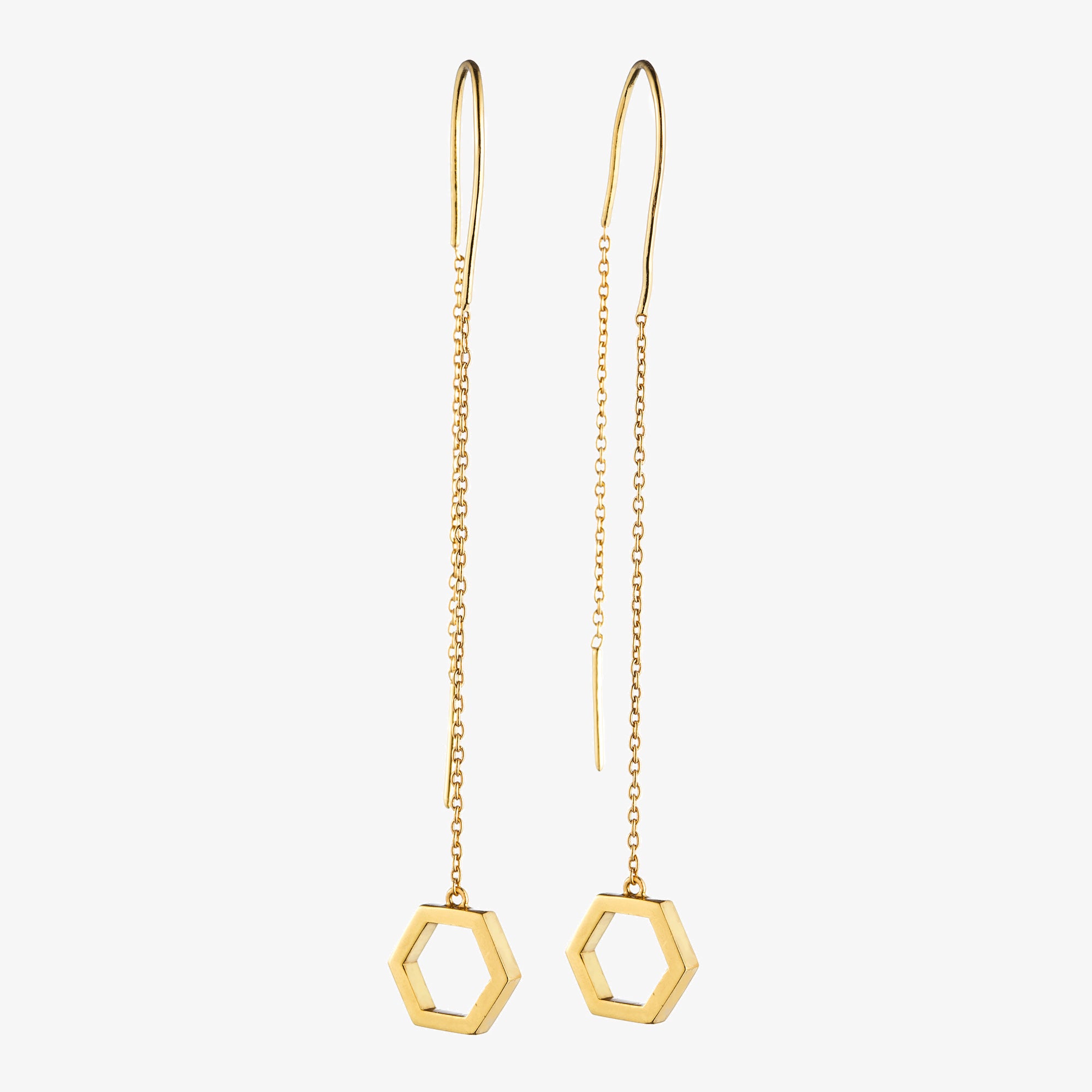 THE HALO DROP EARRING, finished IN 12 KARAT GOLD, IS A LINEAR DROP EARRING, FEATURING A HEXAGON CHARM HUNG FROM DELICATE CABLE LINK CHAIN. AN EXTENDED FRENCH HOOK PULLS THROUGH THE EAR TO HANG. FOR PIERCED EARS.