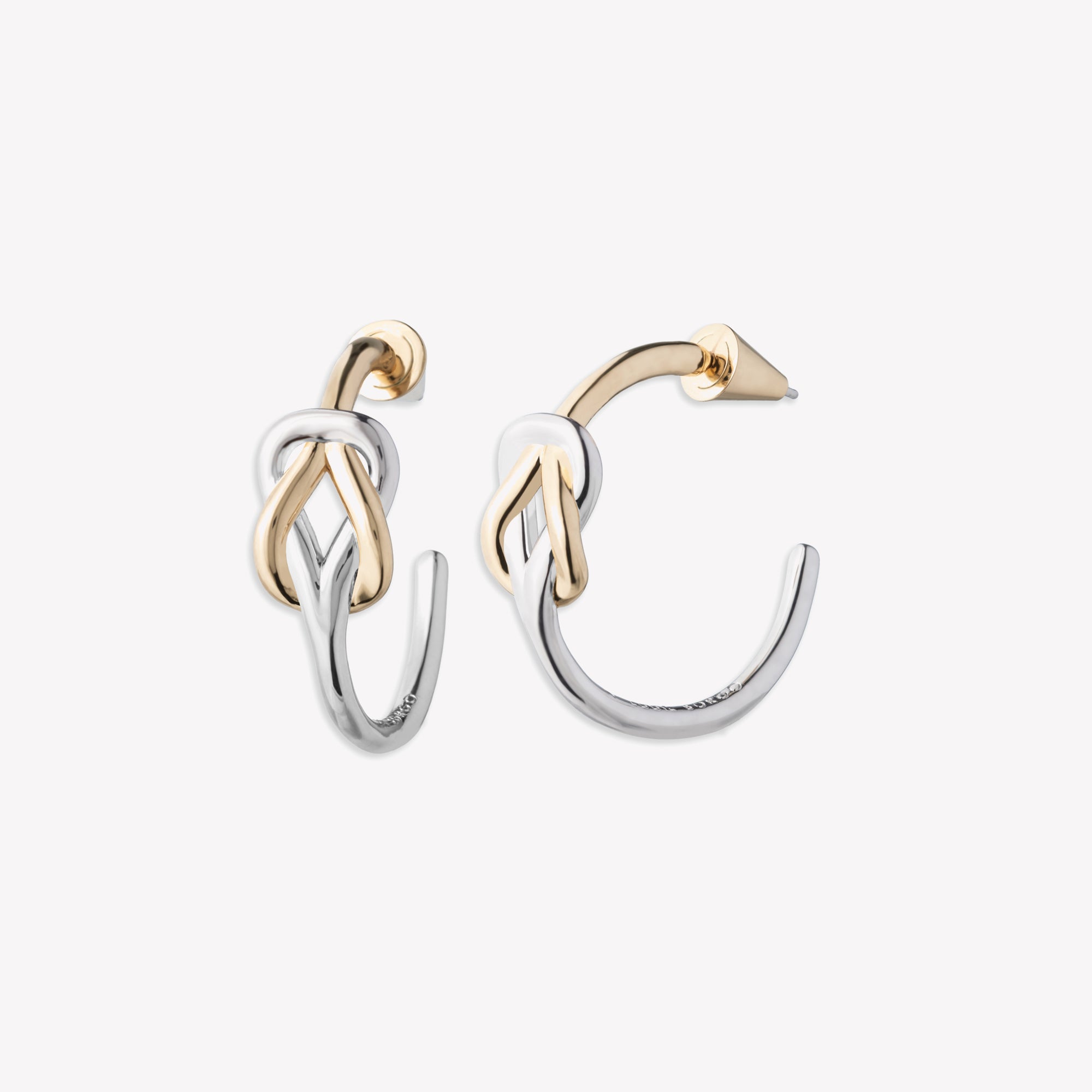 The Slipknot Hoop Earrings in a combination of finishes in 12 karat gold and silver are lightweight, classic hoops, created by carefully forming a tube to create a slipknot that is incorporated into a circular form . Surgical steel posts, secure onto the ear with a custom Eddie Borgo earring backing.