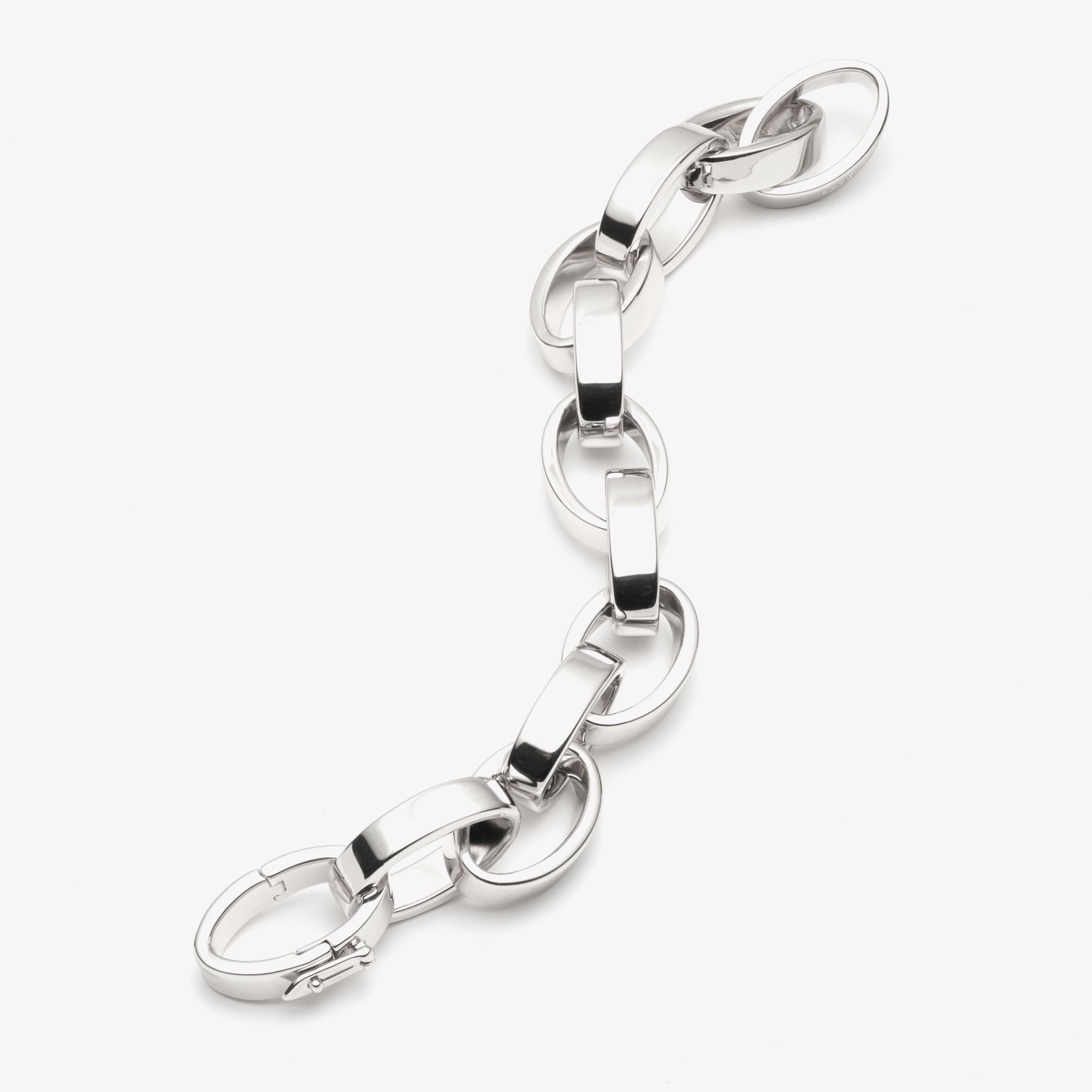 The Large Ellipse Link Bracelet, finished in Silver, is a hand forged composition of large oval looped links. This unique heritage link bracelet can be worn alone or layered with your other bracelets. A custom tension clip easily closes the bracelet around the wrist. Secure with a safety latch.