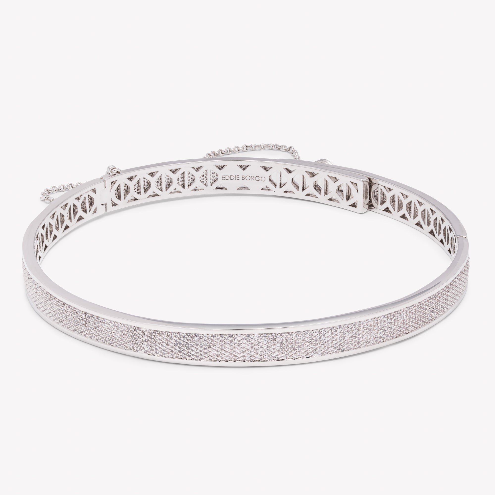 The Pavé Safety Chain Choker, finished in Silver and entirely hand set with a ribbon of pavé crystal. The neckpiece easily opens with handmade piano hinges at each side and and closes with a delicate safety chain. Wear with the chain draped in the front or down the back of the neck.