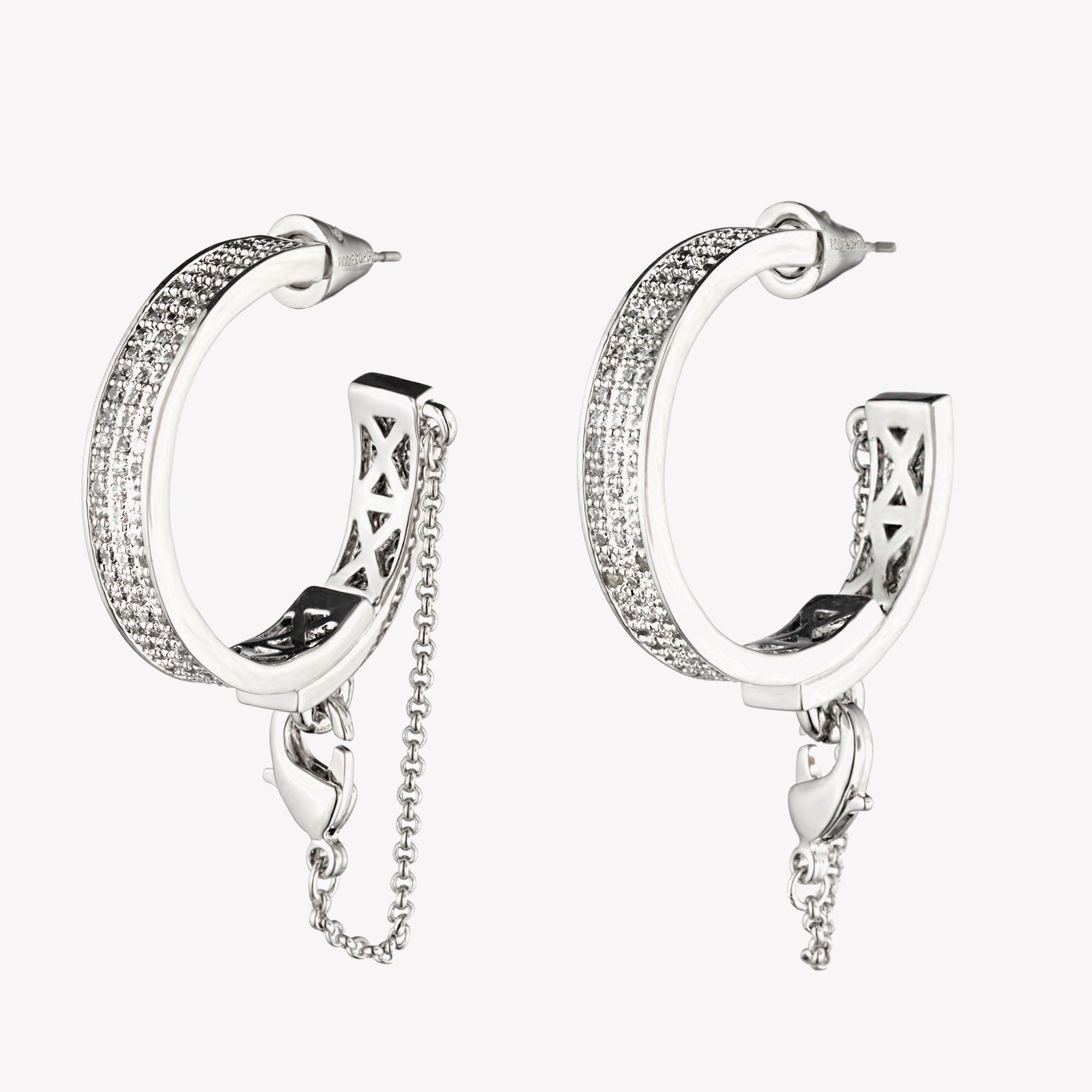 The Pavé Safety Chain Hoop Earrings, finished in Silver, are a classic flat hoop style entirely hand set in delicate pavé crystal. Created by hand, these unique earrings were finished as two overlapping bands, fixed into place with a vintage safety chain closure. Secure with a custom Eddie Borgo earring back. Surgical steel posts, for pierced ears.