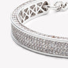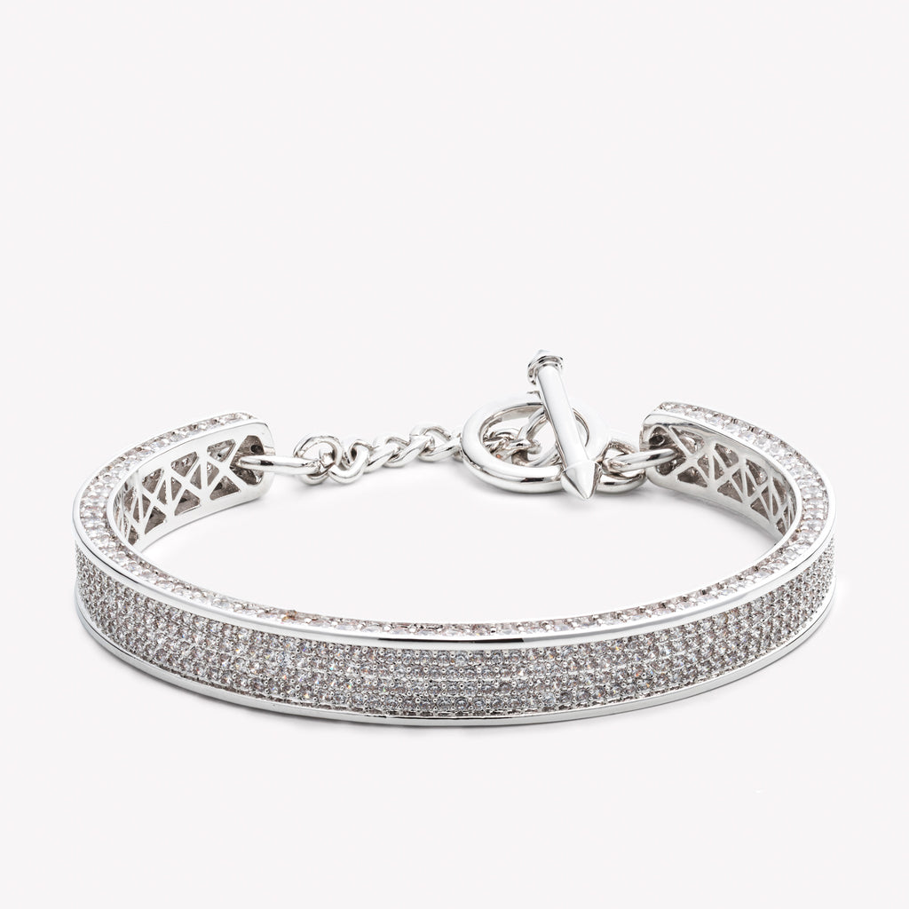 The Pavé Zenith Cuff, finished in Silver, is a classic cuff bracelet that easily slips onto the wrist and can be worn with the custom toggle closure featured in either the back or the front of the wrist. The entire cuff has been hand set in pavé crystal. Caged interior created for weightlessness and comfort.