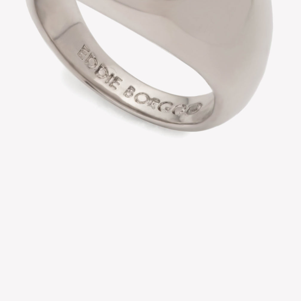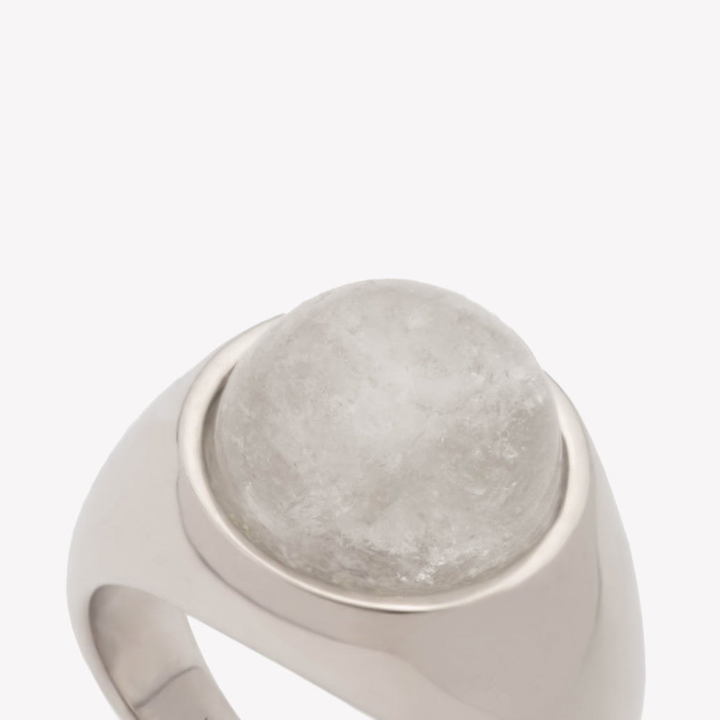 THE INLAID DOME SIGNET RING, finished IN SILVER, IS A CLASSIC ROUND SIGNET RING INLAID WITH A HAND CARVED, DOMED CABOCHON OF GENUINE QUARTZ CRYSTAL. THIS RING CAN BE WORN AS AN EVERYDAY SIGNATURE.