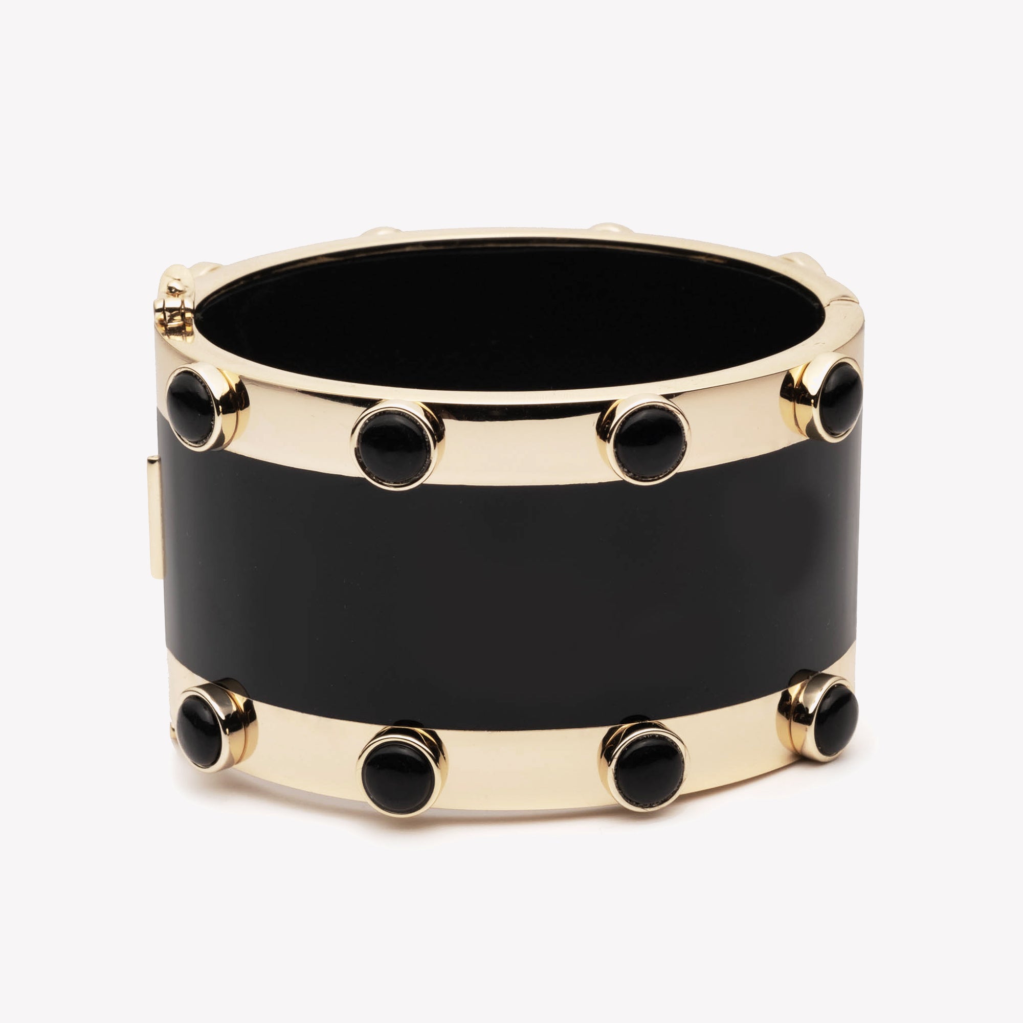 THE INLAID Cabochon Cuff, finished in 12 KARAT gold, IS A WIDE BRACELET THAT HAS BEEN INLAID BY HAND WITH BLACK CLOISONNÉ ENAMEL AND ACCENTED WITH SIXTEEN GENUINE ONYX CABOCHONS. THE INTERIOR IS LINED IN BLACK CALF SKIN. OPEN WITH A CUSTOM PUSH CLOSURE AT ONE SIDE AND SECURE WITH A SAFETY LATCH.