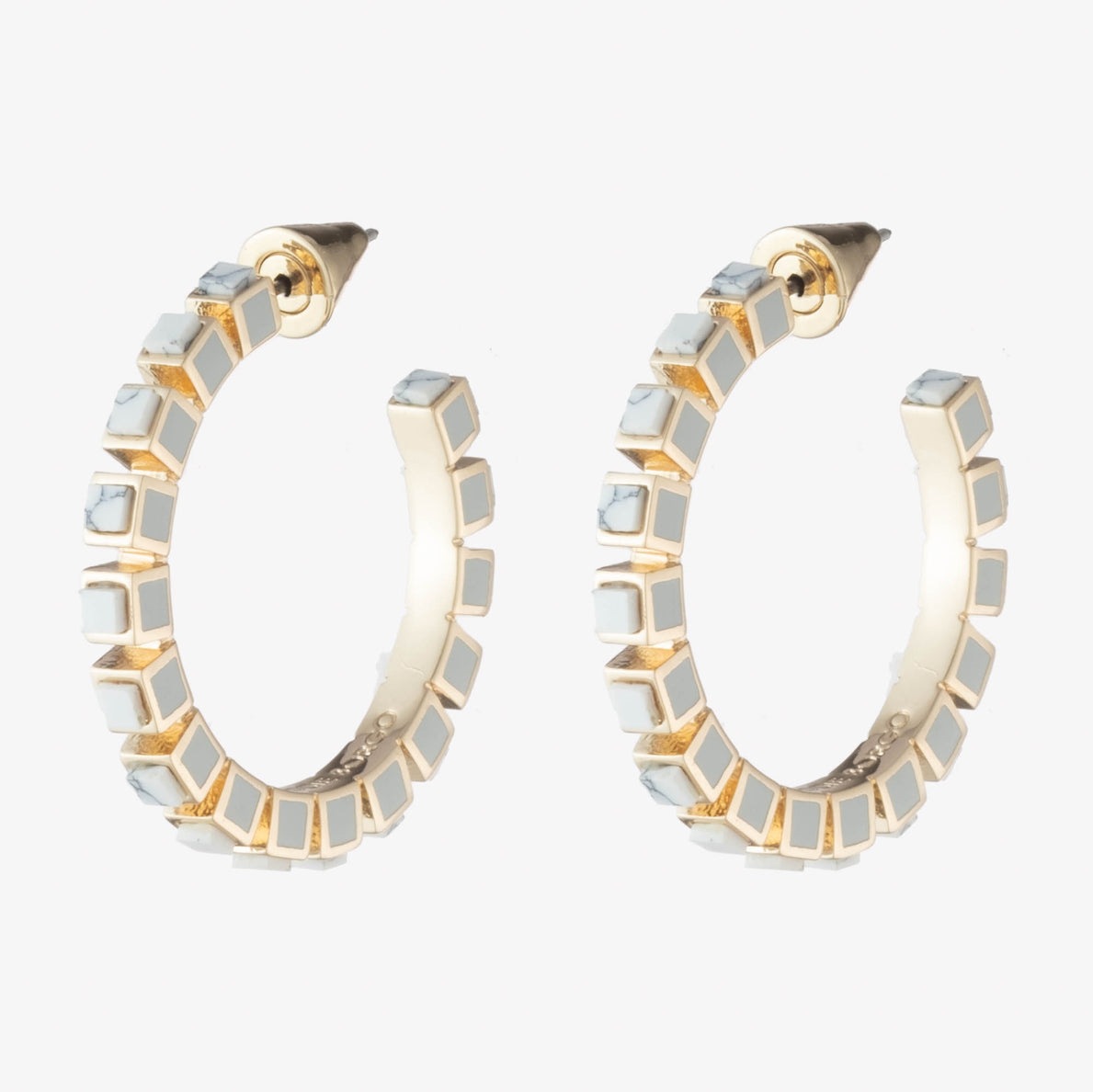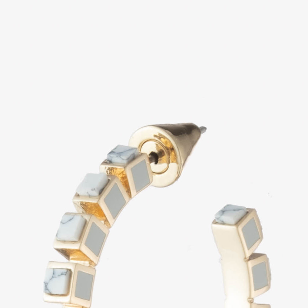 The Small Inlaid Cube Hoop Earrings, finished in 12 Karat Gold, have been carefully inlaid with delicate semi precious cubes of Howlite. Each cube is inlaid by hand, then carefully finished with off-white cloisonné enamel along each side.
