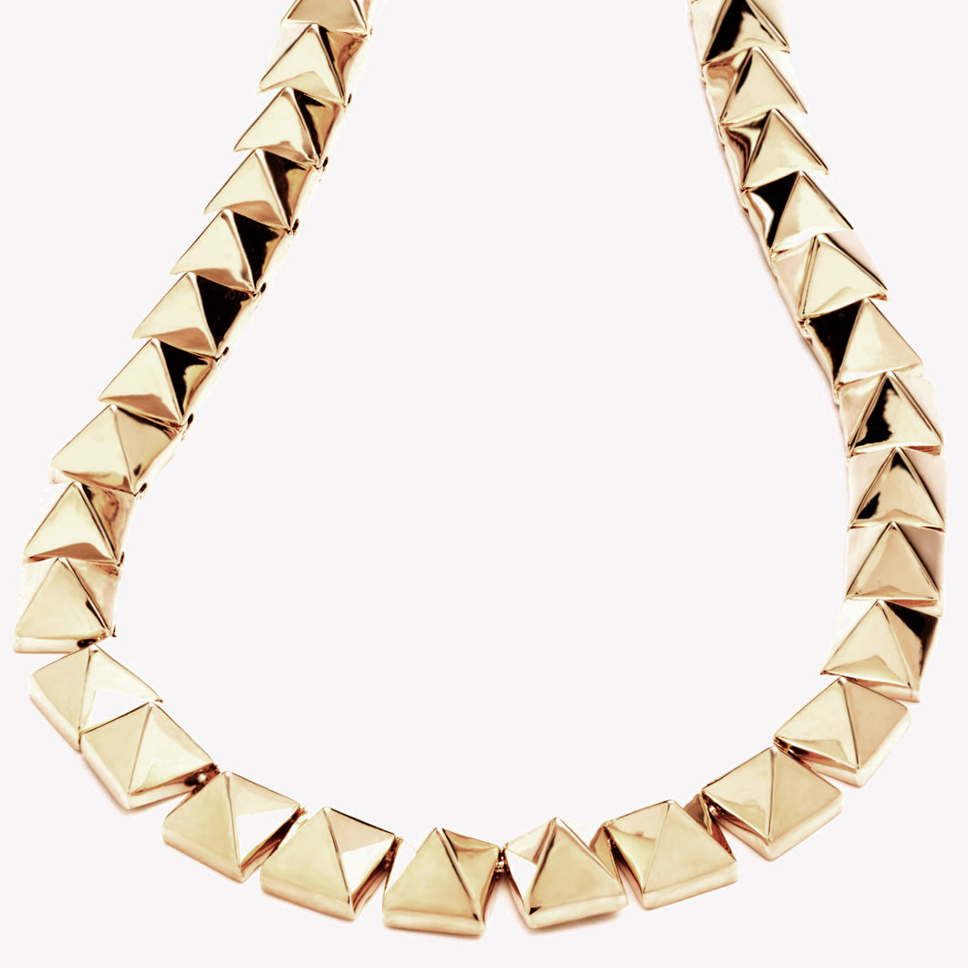 The Pyramid Necklace, finished in 12 karat gold, is a signature Eddie Borgo piece, composed of pyramid shapes joined together by had with individual hinges. A classic necklace, wear the pyramid necklace alone or layered with longer, delicate link necklaces. Close with a box and tongue clasp and secure with two custom safety latches.