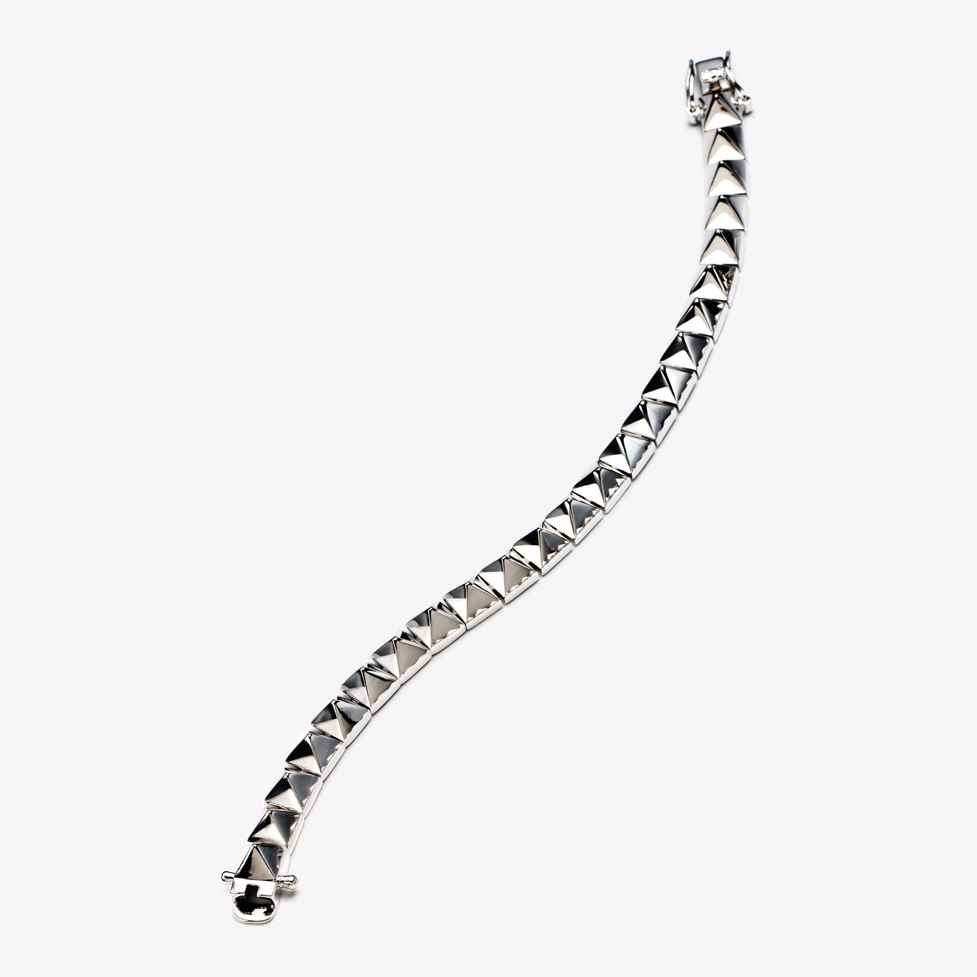 The Pyramid Bracelet, finished in Silver, is our signature bracelet, composed of pyramid shapes joined together by hand with individual hinges. A classic Eddie Borgo piece, wear the pyramid bracelet alone or alongside your other pyramid bracelets. Close with a box and tongue clasp and secure with two safety latches.