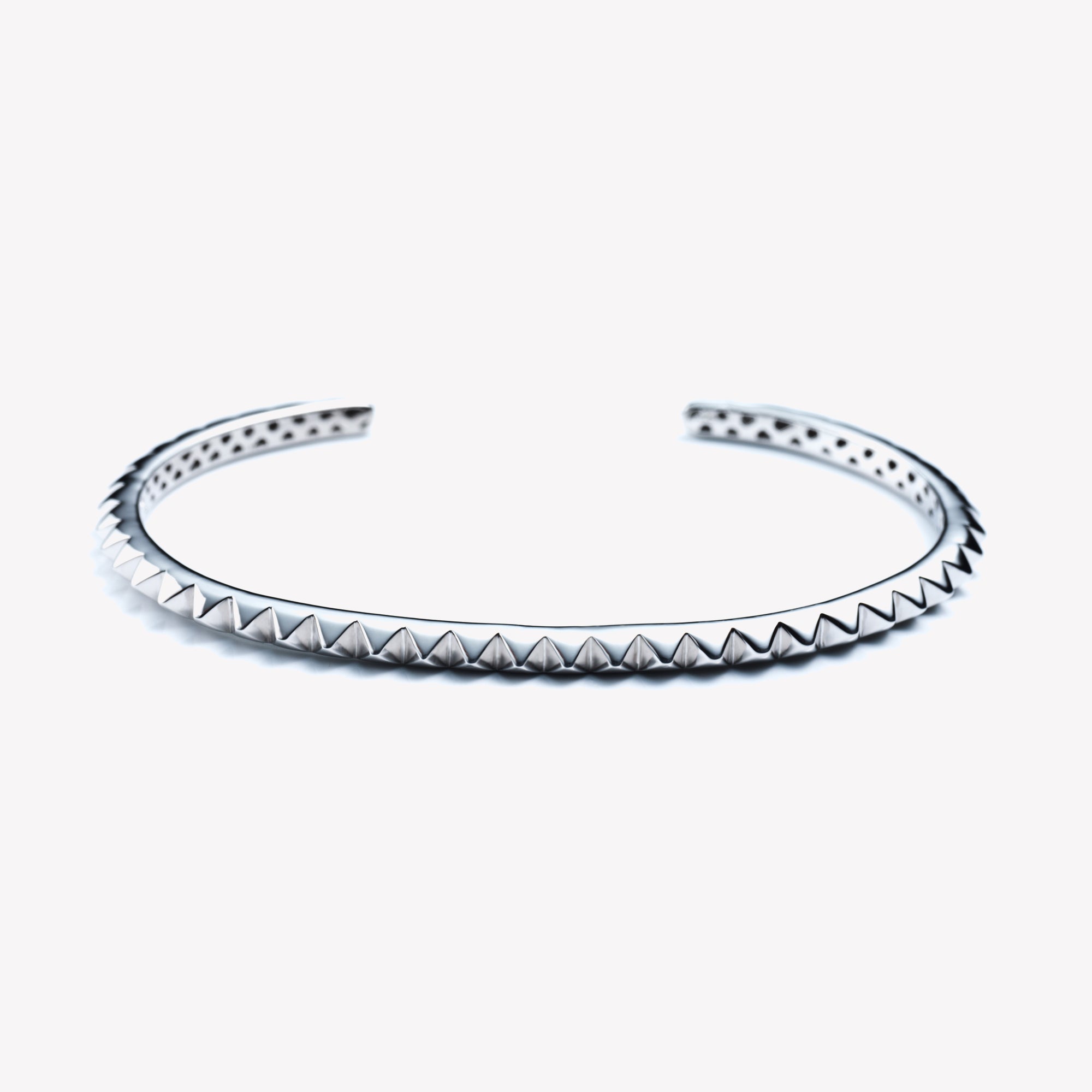 The Thin Pyramid Cuff, finished in silver, is a classic Eddie Borgo cuff style. Entirely carved by hand and caged on the backside for comfort. Created to easily slip on and off the wrist, this signature bracelet can be worn alone or worn alongside the pyramid cuff.