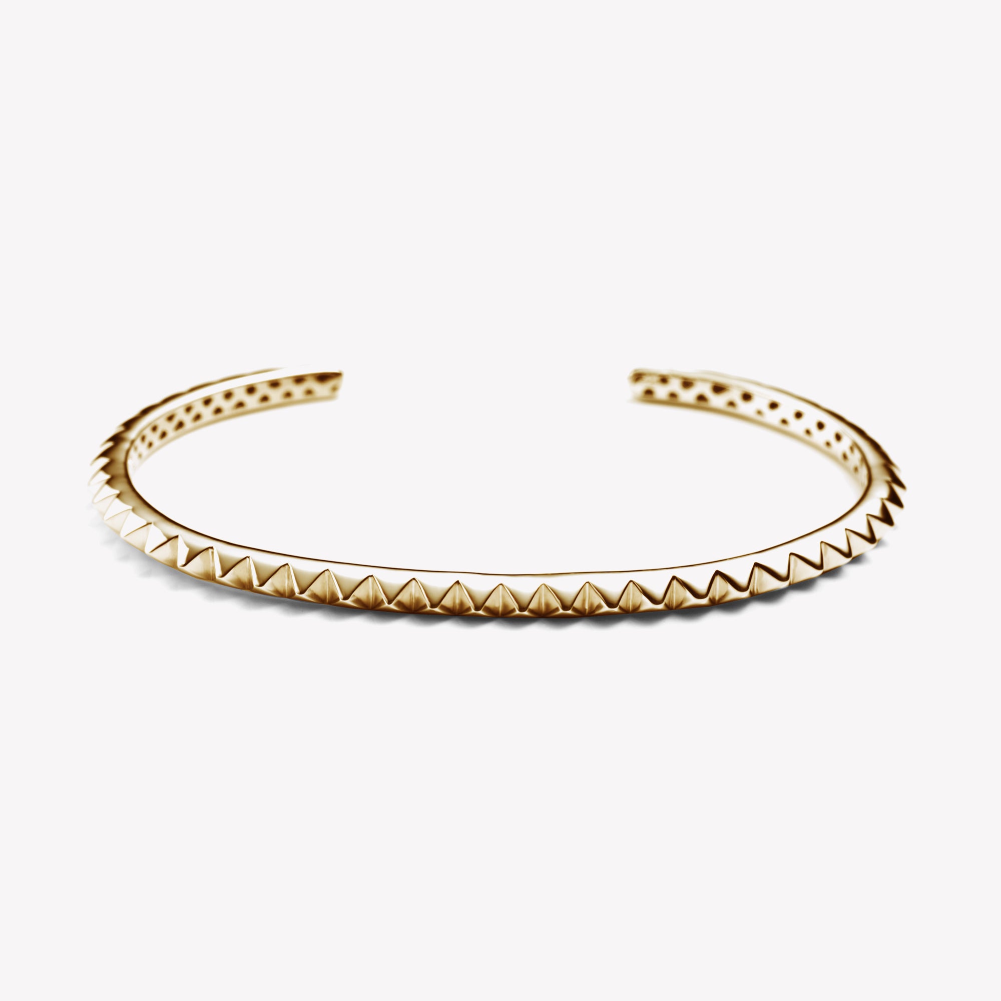The Thin Pyramid Cuff, finished in 12 karat gold, is a classic Eddie Borgo cuff style. Entirely carved by hand and caged on the backside for comfort. Created to easily slip on and off the wrist, this signature bracelet can be worn alone or worn alongside the pyramid cuff.