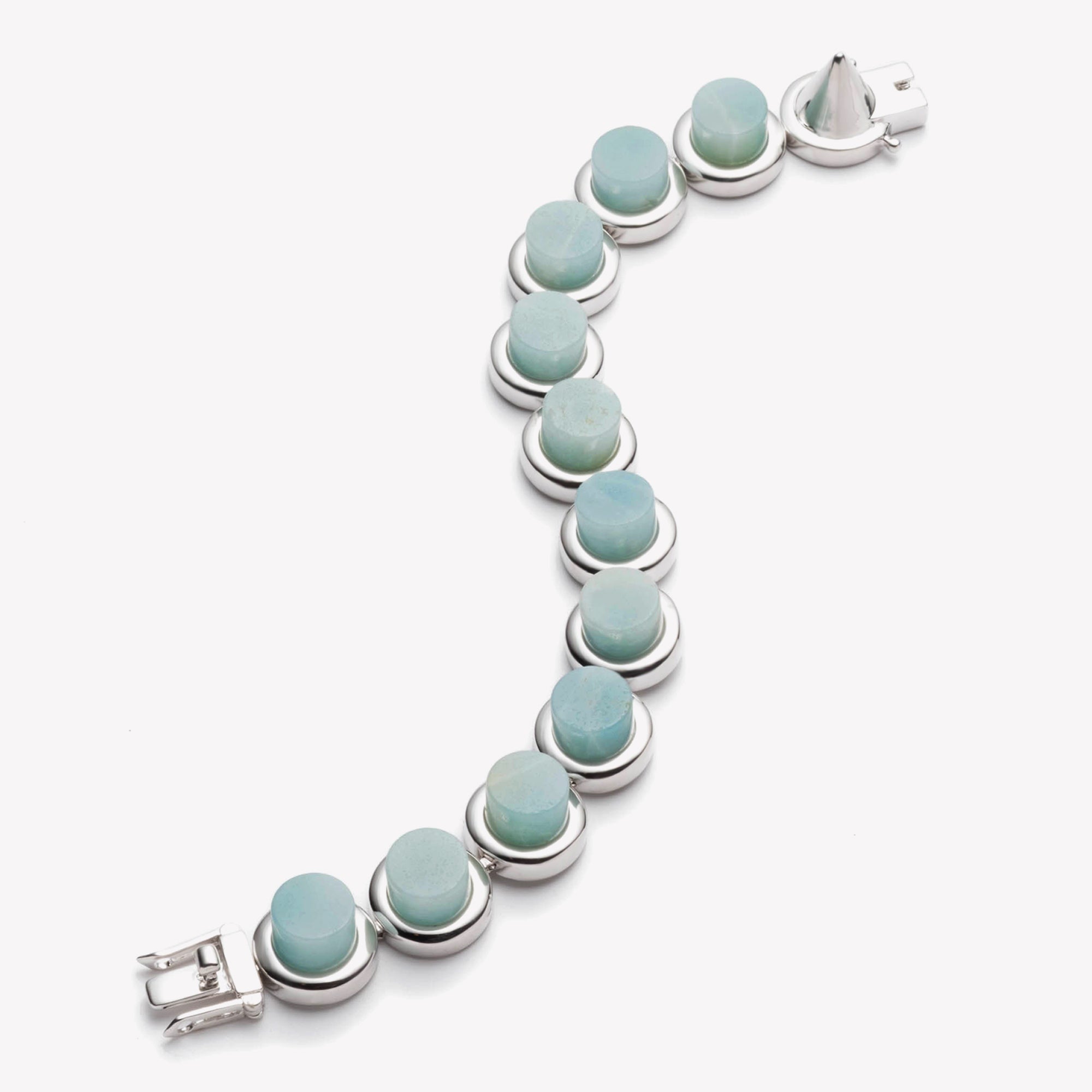 THE CLASSIC CYLINDER BRACELET, SET WITH HAND CUT AMAZONITE STONES INTO BEZEL SETTINGS, finished in silver. THE BRACELET IS BACKED WITH CUSTOM EDDIE BORGO CAGE WORK TO SECURE EACH UNIQUE STONE. CLOSES WITH A BOX CLOSURE AND SECURES WITH A SAFETY LATCH.