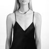 Juxtaposing structured form with fluidity, the Folded Collar features a hand formed drape at the center of the neck. This unique piece opens easily on a hinge and slips over the neck. Finished in silver. Fits all neck sizes.