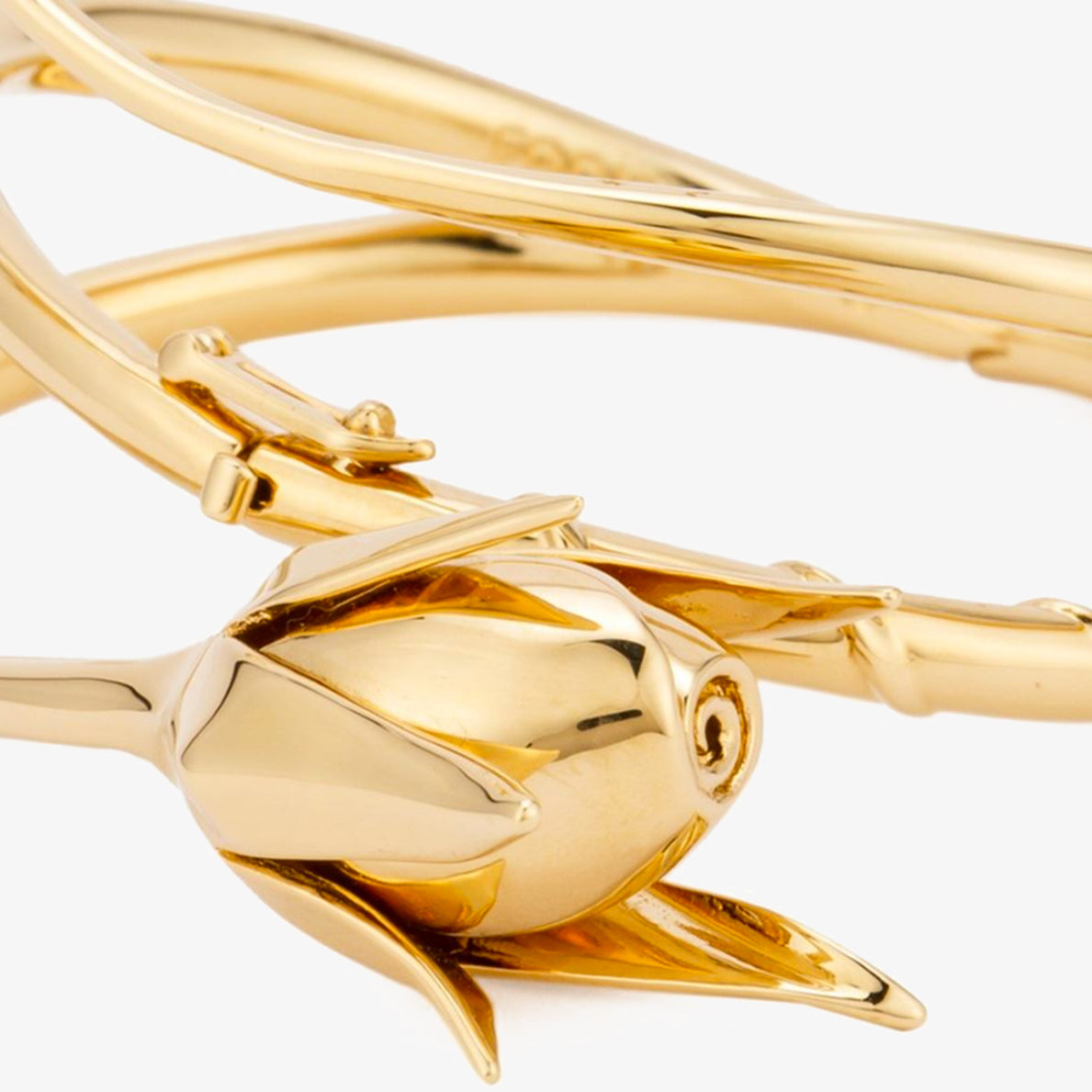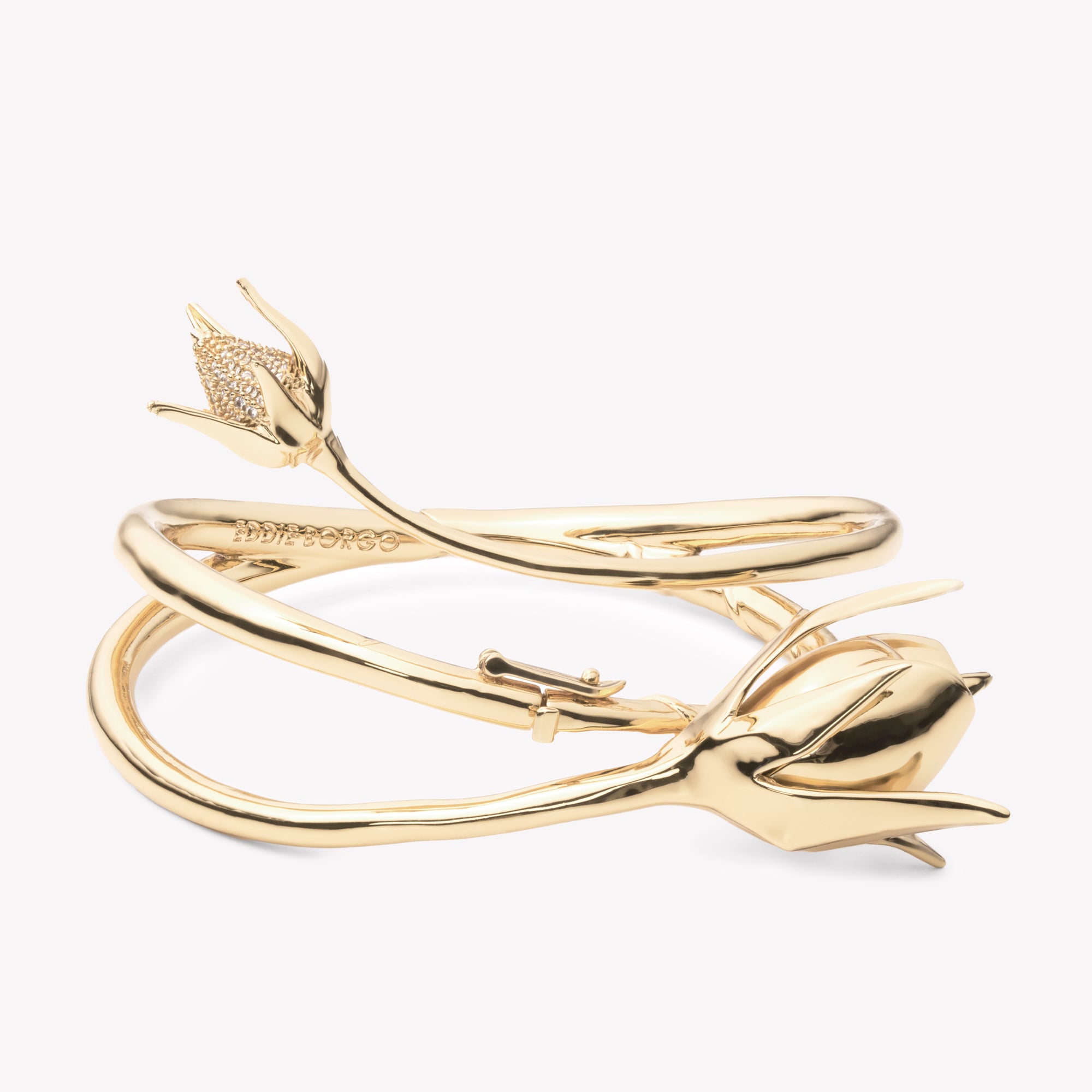 THE Climbing Rose Cuff, finished in 12 Karat Gold, is a hand carved, twining cuff, intricately created to surround the wrist just so. Rose buds anchor the piece at each side, the center of the smaller covered in hand set pavé. Open with a clever, discreet push button closure built into the center of the bracelet and slip the hand through. Secure with a safety latch.