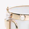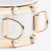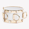 THE Pearl D-Ring Cuff, finished in 12 karat gold, IS A WIDE CUFF BRACELET THAT HAS BEEN INLAID BY HAND WITH WHITE GROUND ENAMEL AND ACCENTED WITH SIXTEEN PINNED FRESHWATER PEARLS. SWINGING D-RINGS RUN ALONG THE FRONT AND BACK OF THIS UNIQUE CUFF, AND THE INTERIOR IS LINED IN WHITE CALF SKIN. OPEN WITH A CUSTOM PUSH CLOSURE AT ONE SIDE AND SECURE WITH A SAFETY LATCH.