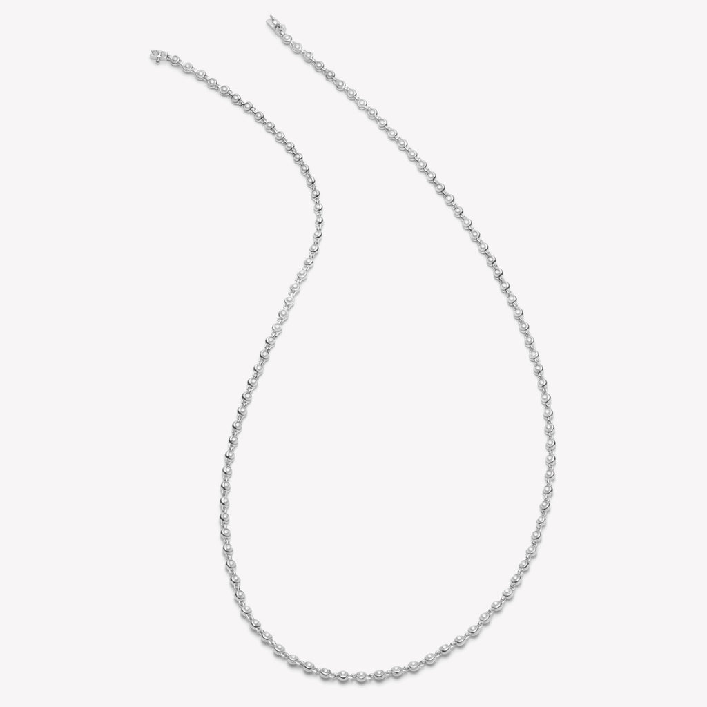 The inlaid pearl necklace, finished in silver, is a classic link necklace, composed of individually channel set cabochons of freshwater pearls. Intricately linked together with our trademark hinge work, each piece contains over 250 hand set pearls. Close at the back with a custom box closure and secure with a safety latch.