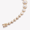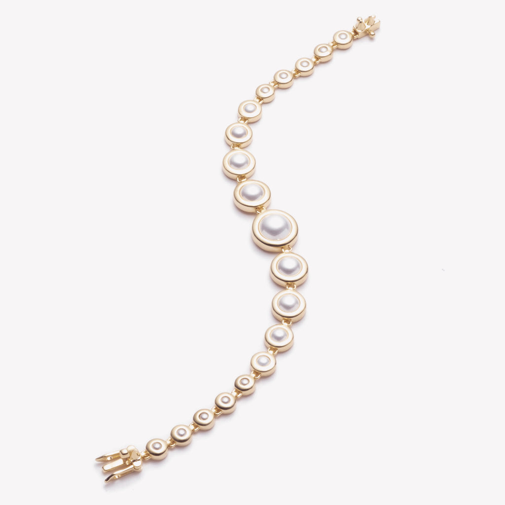 The graduated pearl bracelet, finished in 12 karat gold, is a hand made, hinged bracelet created from graduated bezel settings that are each carefully set with a unique freshwater pearl. Each pearl has been selected and set by hand and finished at the back with a cage for comfort. Close with a custom box closure and secure with two safety latches.