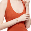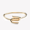 The Allure Bracelet, finished in 12 Karat Gold, is a fitted, hinged architectural cuff. This bracelet is hand formed to interlock two bands into this unique shape. Easily opens at the side with a secure push button closure.