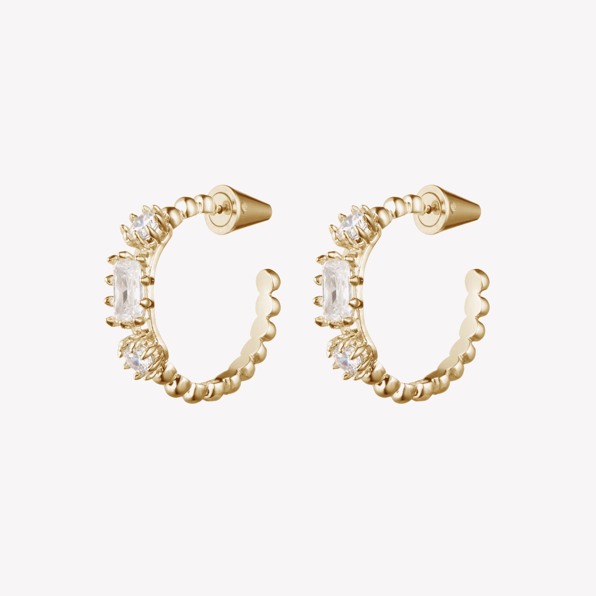 The Estate Hoop Earrings, finished in 12 karat gold, have been accented with a trio of faceted rectangle and round cut crystals, carefully prong set into place. The remainder of the earring has been formed from our signature dome motif. Secure with a custom Eddie Borgo earring backing. Surgical steel posts, for pierced ears.