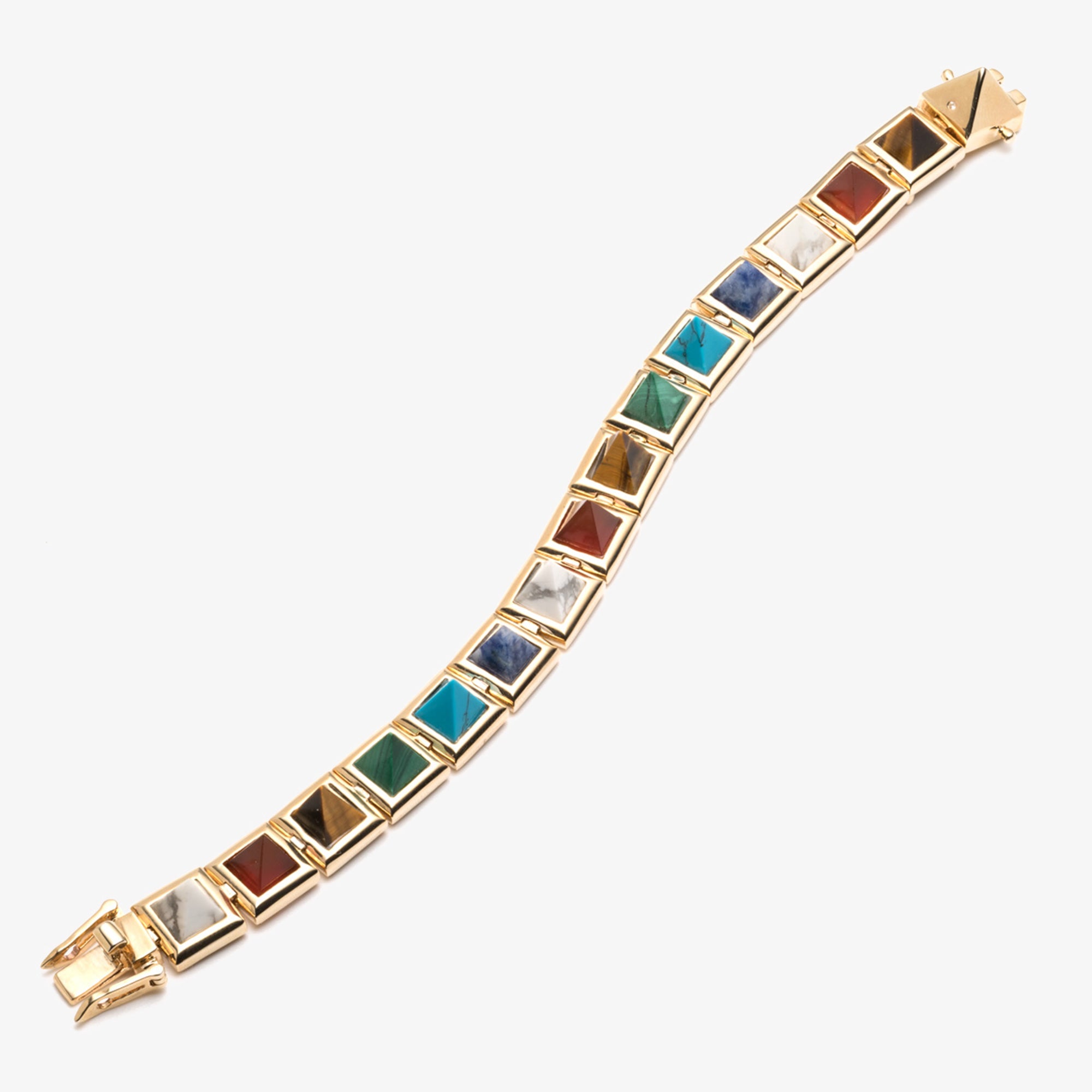 The classic Medium Gemstone Pyramid Bracelet, featuring hand cut semi precious stones of Howlite, Carnelian, Tiger's Eye, Malachite, Turquoise, and Lapis Lazuli. Each unique stone is hand set into a bezel setting, finished in 12 Karat Gold. The bracelet is backed with custom Eddie Borgo cage work to secure each unique stone. Closes with a box closure and secures with a safety latch.