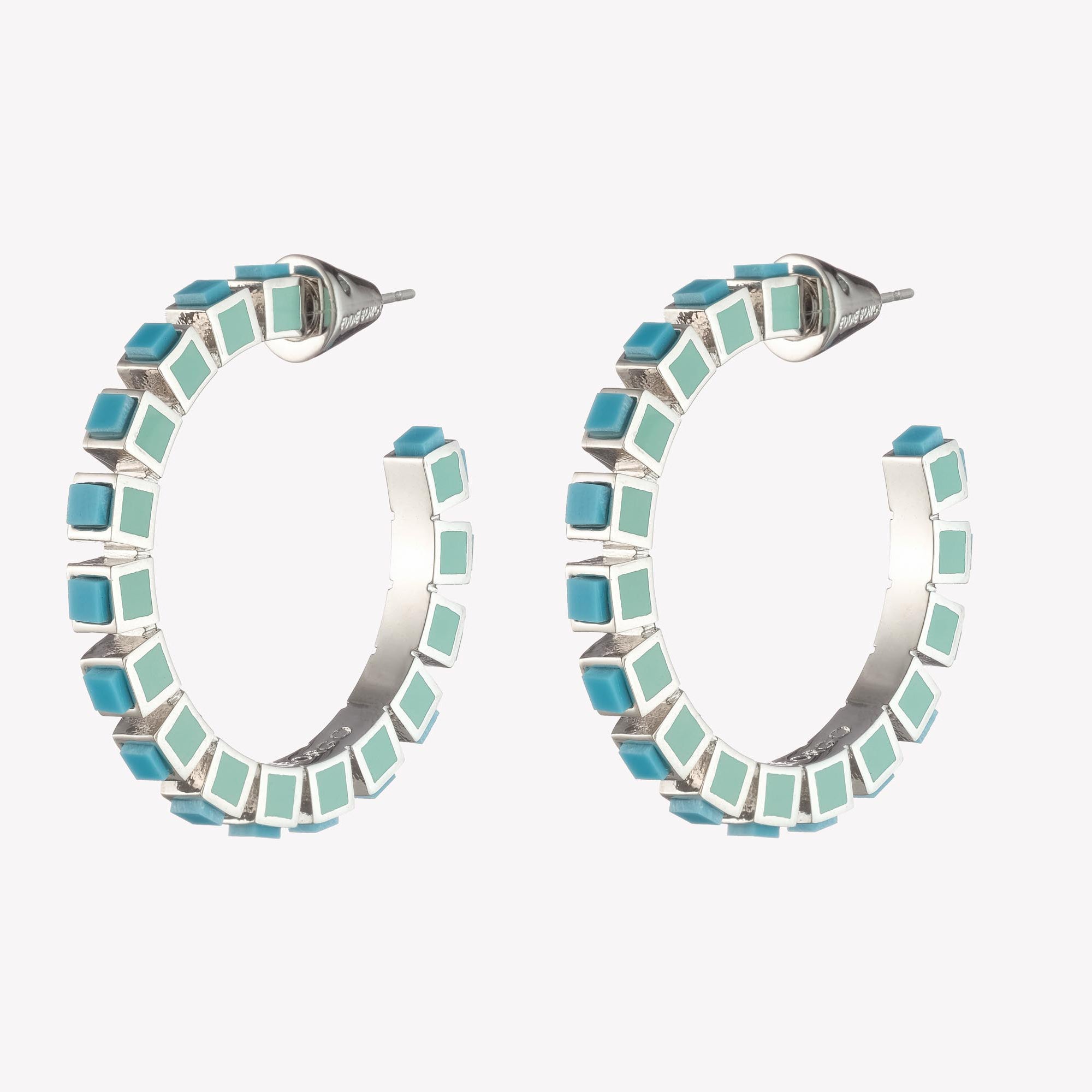 THE SMALL INLAID CUBE HOOP EARRINGS, finished IN SILVER, HAVE BEEN CAREFULLY INLAID WITH DELICATE SEMI PRECIOUS CUBES OF TURQUOISE. EACH CUBE IS INLAID BY HAND, THEN CAREFULLY FINISHED WITH TURQUOISE CLOISONNÉ ENAMEL ALONG EACH SIDE.