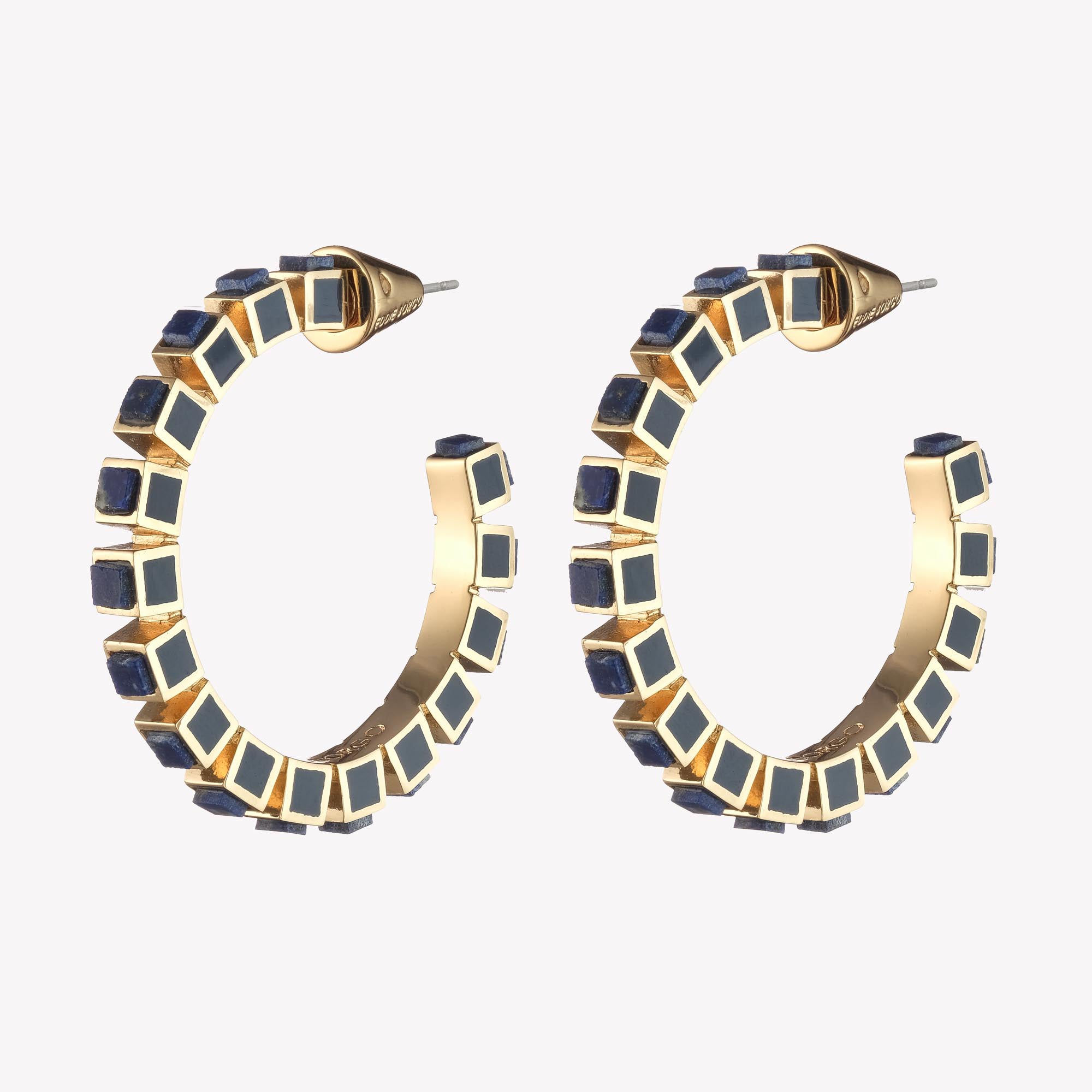 THE SMALL INLAID CUBE HOOP EARRINGS, finished IN 12 KARAT GOLD, HAVE BEEN CAREFULLY INLAID WITH DELICATE SEMI PRECIOUS CUBES OF LAPIS LAZULI. EACH CUBE IS INLAID BY HAND, THEN CAREFULLY FINISHED WITH NAVY BLUE CLOISONNÉ ENAMEL ALONG EACH SIDE.