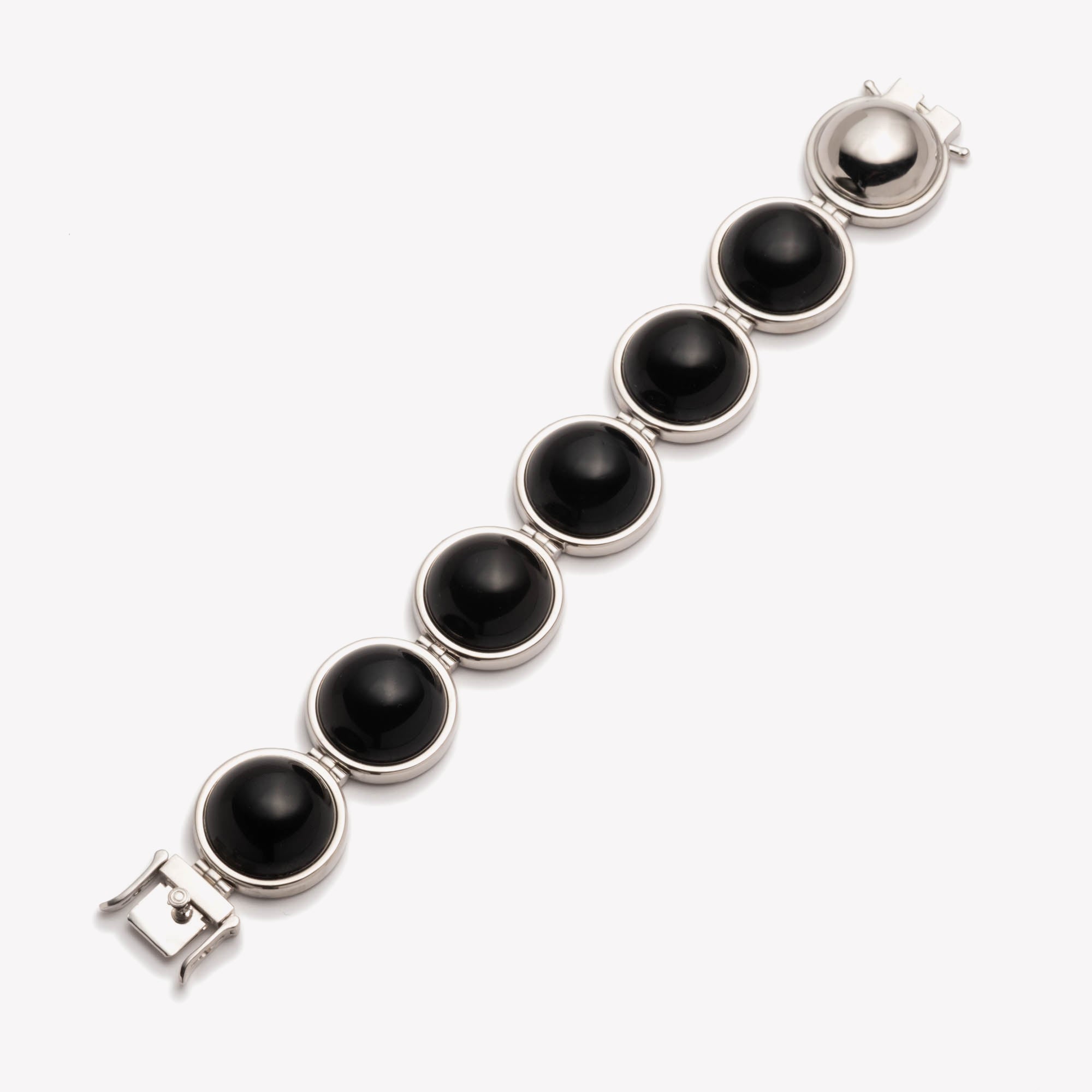 THE LARGE INLAID DOME BRACELET, finished IN silver, IS COMPOSED OF SIX CARVED CABOCHON PIECES OF GENUINE BLACK ONYX, hand set into a silver, caged bezel. EACH station is LINKED TOGETHER BY HAND TO CREATE OUR SIGNATURE LINK MOVEMENT. CLOSE WITH A CUSTOM EDDIE BORGO BOX CLOSURE, SECURES WITH A DOUBLE SAFETY LATCH.