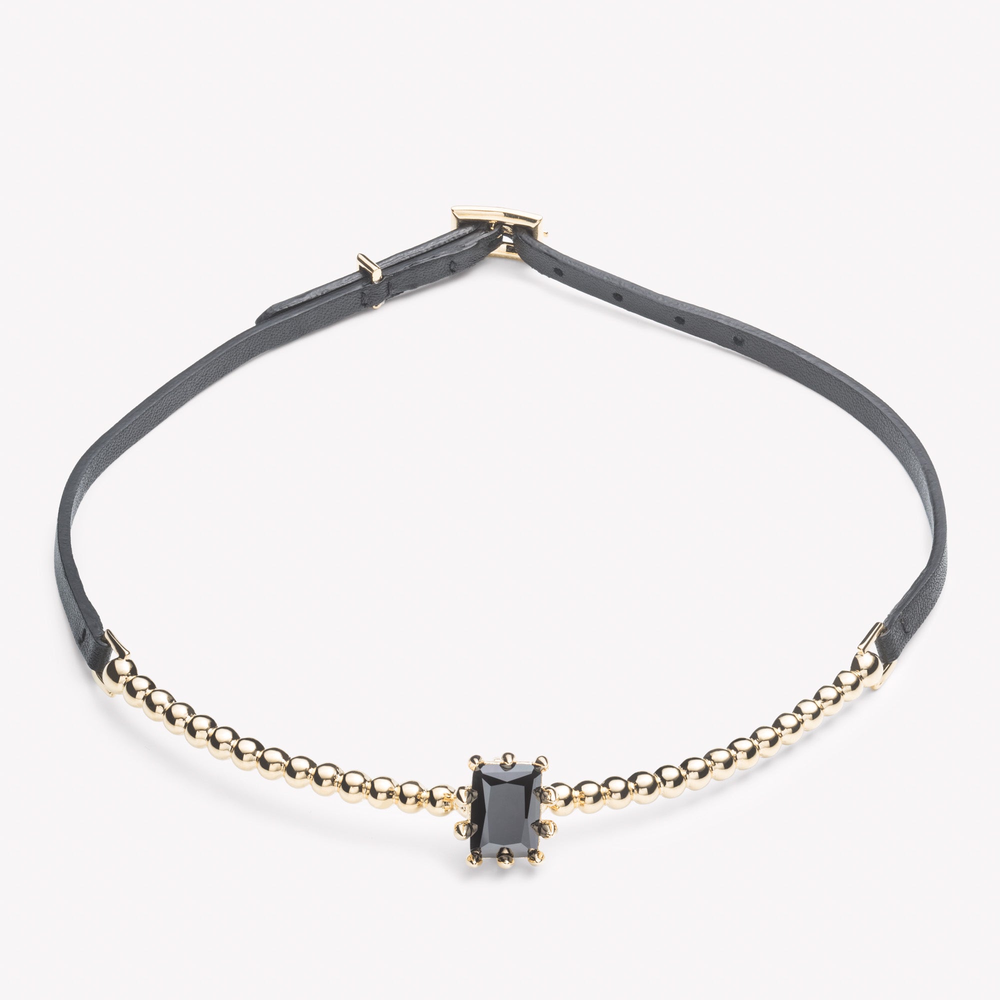 The Dome Estate Collar, finished in 12 karat gold, has been created from a front plate. The front plate is formed from our signature dome motif, and hand set with a single hand-faceted jet crystal. The stone has been emerald cut by hand with step-cut facets, for subtle shimmer.