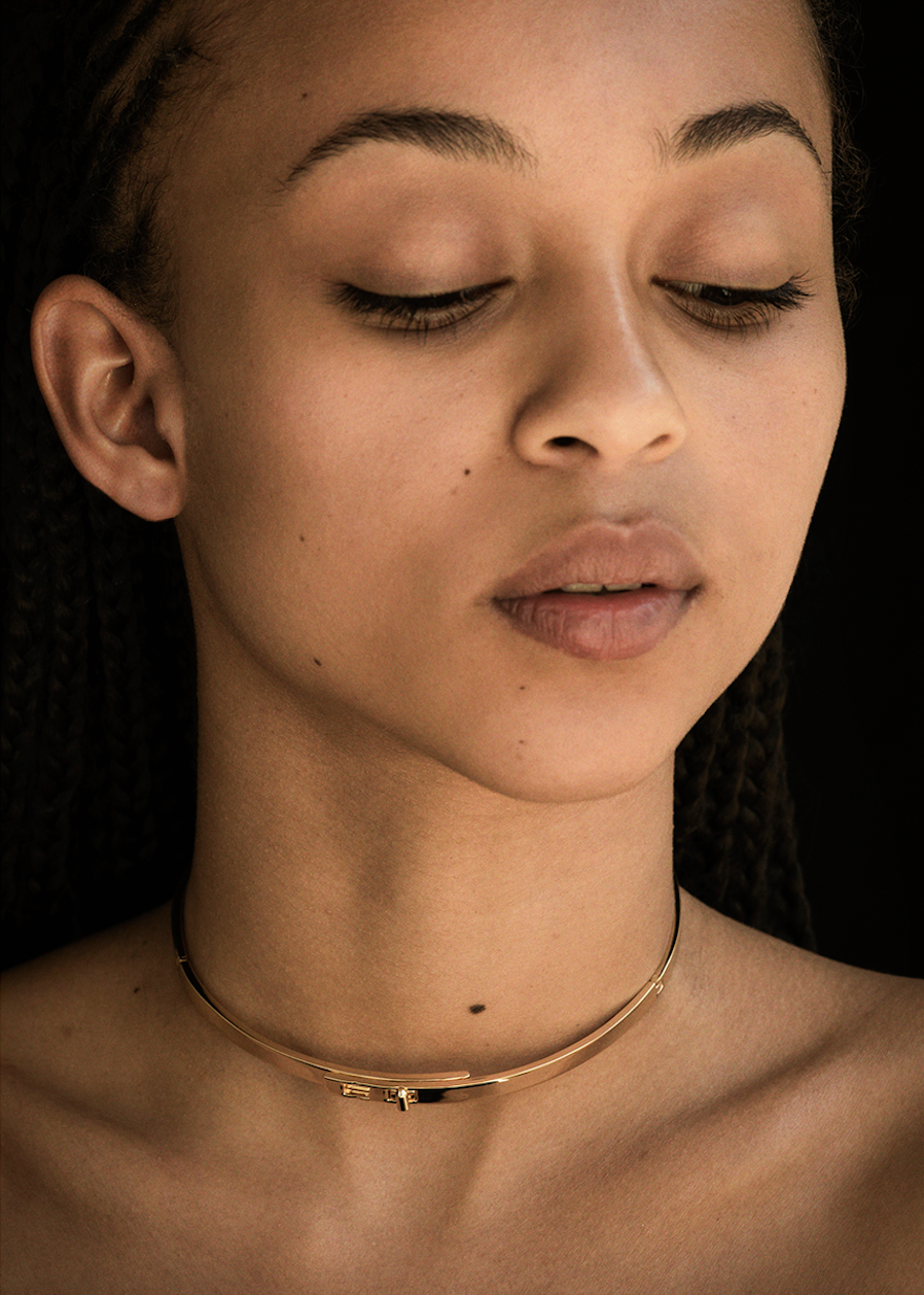 The Turnlock Collar, finished in 12 Karat Gold, is an inimitable neckpiece, opening easily by turning the miniature turnlock. Two piano hinges at each side allow the piece to open and slip onto the neck. This delicate choker can be worn with the turnlock detail in the front or in the back of the neck, alone or layered with your delicate necklaces.