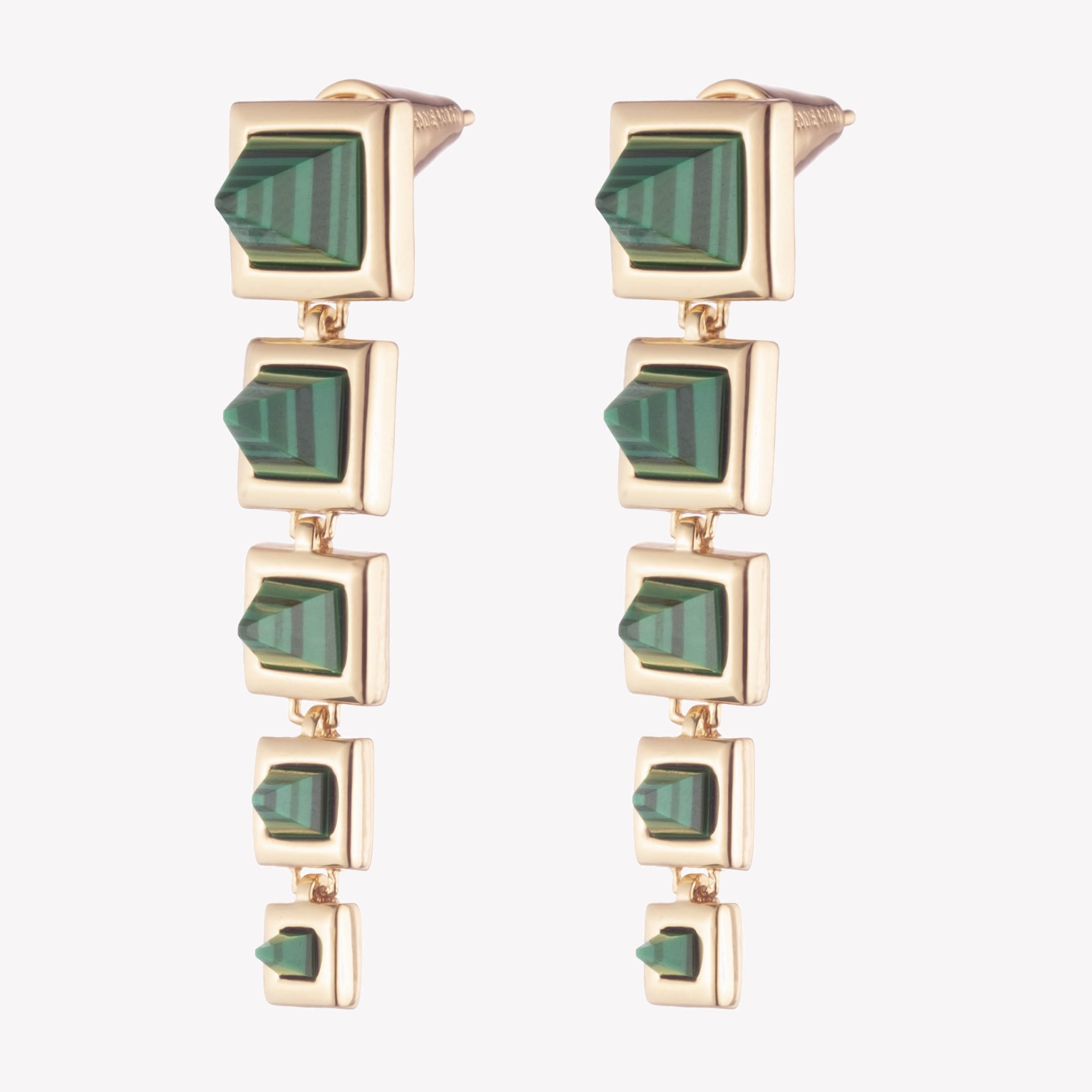 The graduated pyramid earrings, finished in 12 Karat Gold, are hand made, created from graduated bezel settings that are each carefully set with a hand carved semi-precious pyramids of genuine Malachite. Each stone has been selected, carved, set by hand and finished at the back with a custom cage. Secure onto the ear with a custom Eddie Borgo earring backing. Surgical steel posts, for pierced ears.
