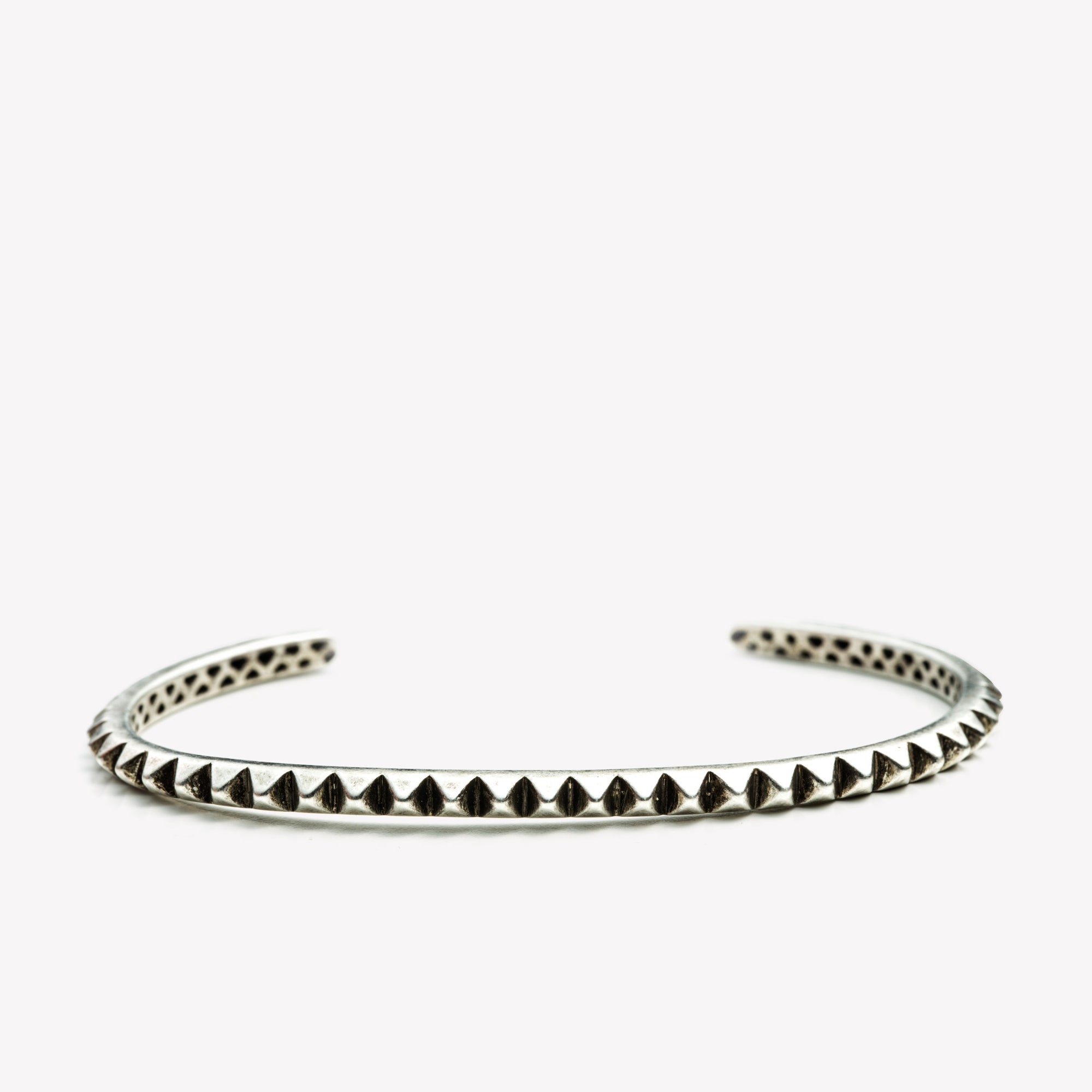 Sterling silver thin pyramid cuff plated in oxidized silver, with an interior engraved logo.