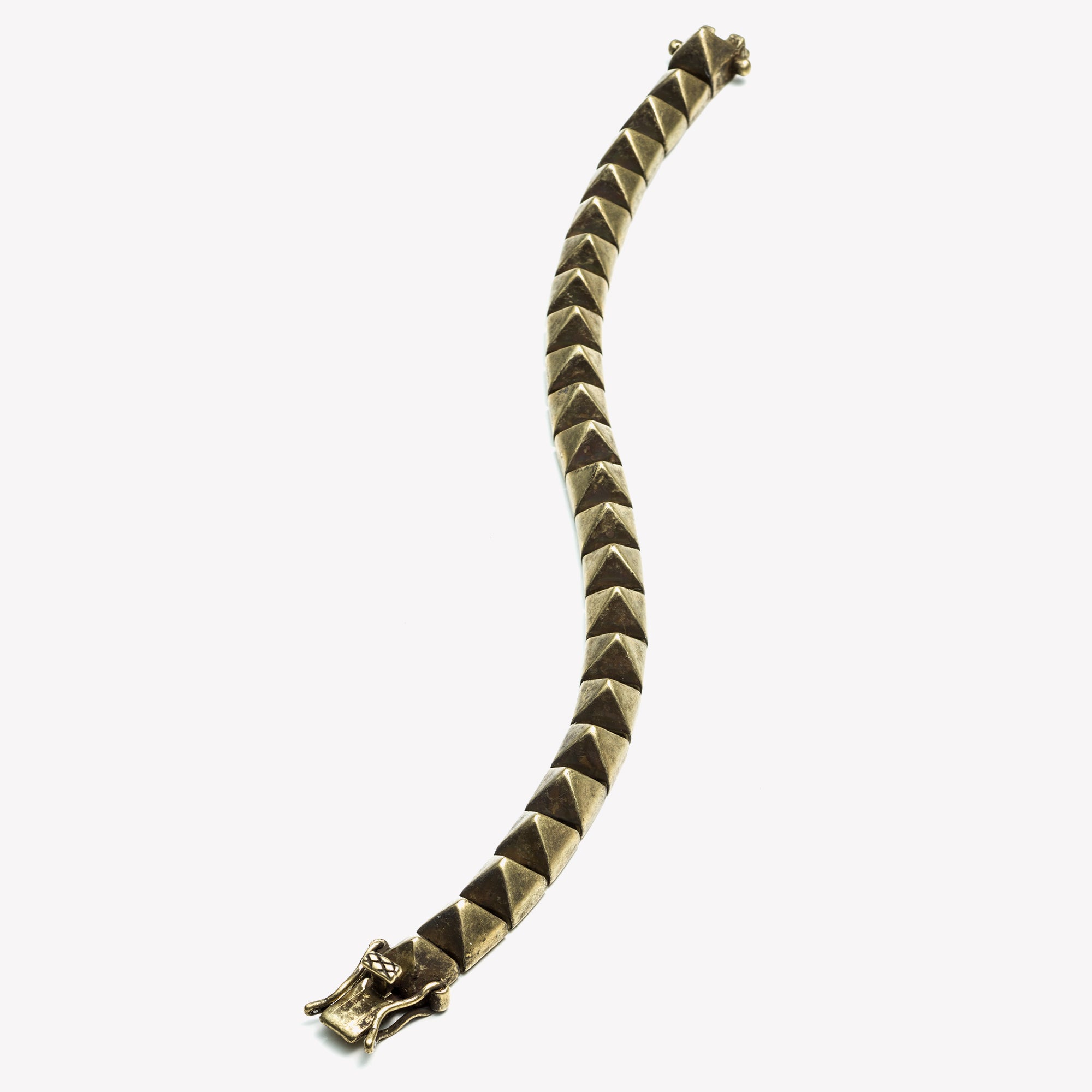 THE MENS PYRAMID BRACELET IN STERLING SILVER HAS BEEN FINISHED IN BURNISHED BRASS. OUR SIGNATURE BRACELET IS COMPOSED OF PYRAMID SHAPES JOINED TOGETHER BY HAND WITH INDIVIDUAL HINGES. A CLASSIC EDDIE BORGO PIECE, WEAR THE PYRAMID BRACELET ALONE OR ALONGSIDE YOUR TIMEPIECE. CLOSE WITH A BOX AND TOUNGE CLASP AND SECURE WITH TWO SAFETY LATCHES.