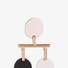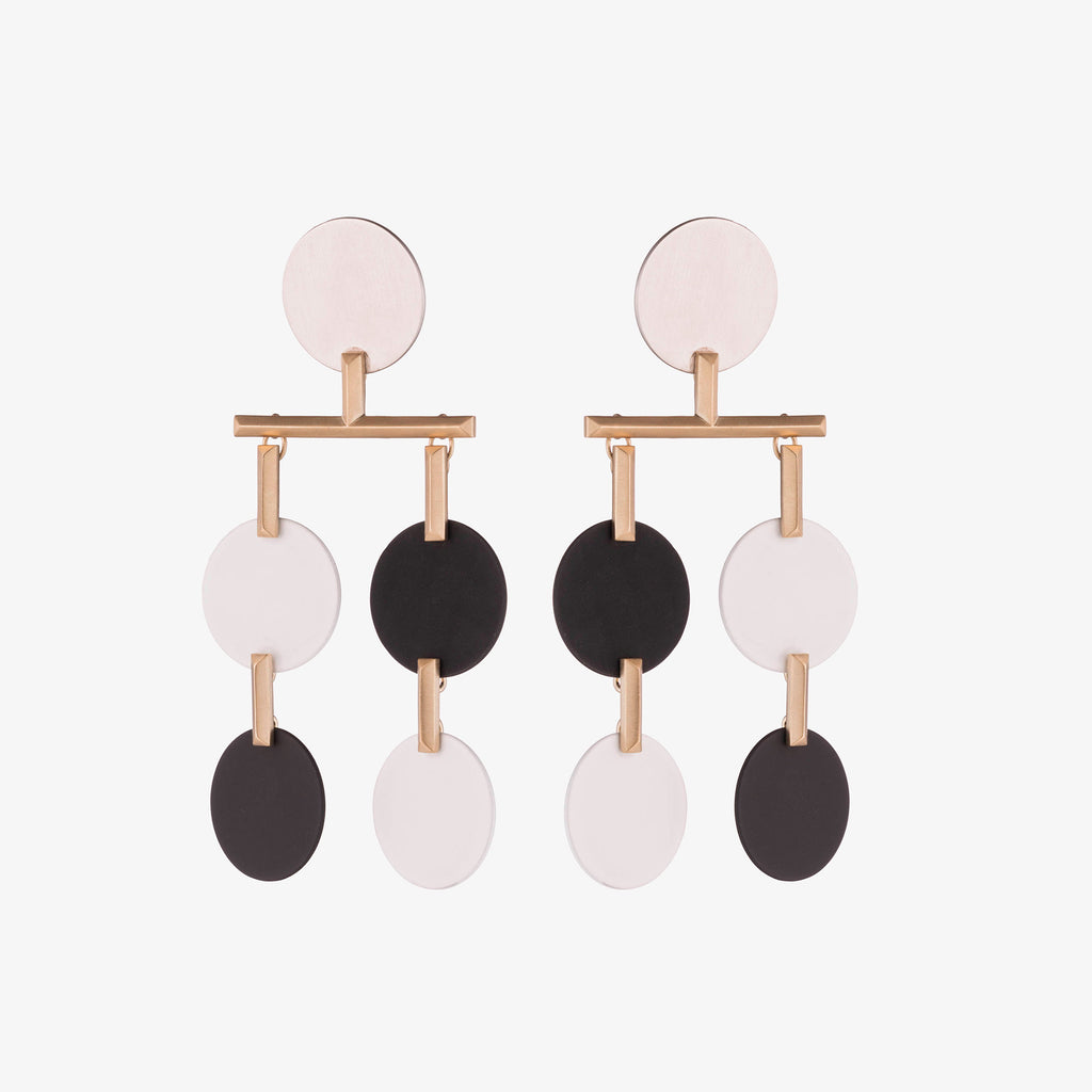 Two tiers of flat, round discs finished in brushed silver, brushed 12 karat gold, and black and white matte hand-applied enamel are carefully balanced from a sleek bar in the Token Chandelier Earrings. Carefully created to distribute balance and lightweight, these unique, sculptural earrings will quickly become a favorite.