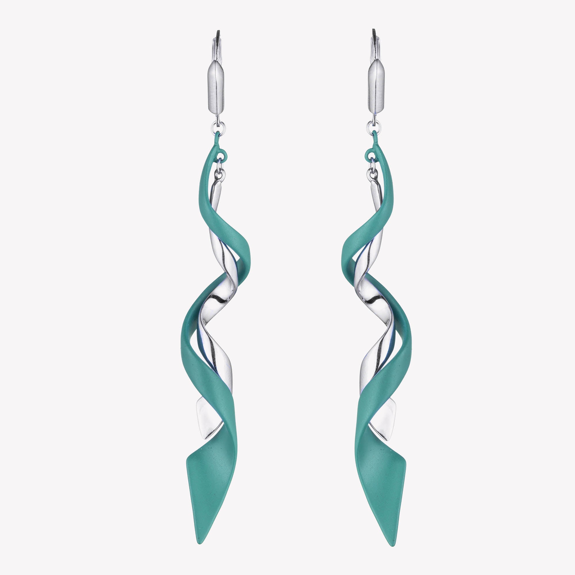 The Spiraled Ribbon earrings in a combination of STERLING SILVER VERMEIL AND AZURE BLUE PATINA combine two hand formed, intersecting ribbons of metal, hung from a surgical steel ear wire. These earrings were created to move with the wearer, to a dramatic effect.