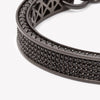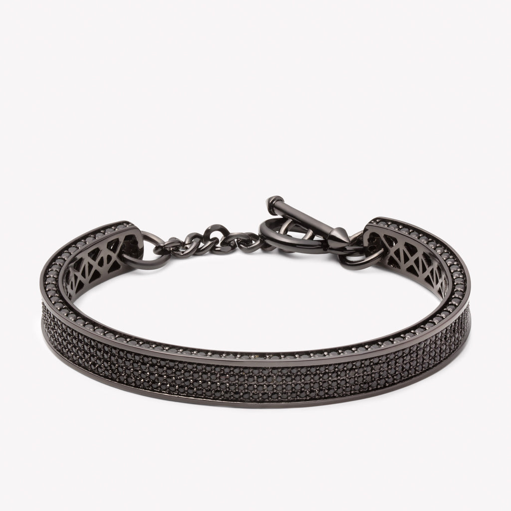 THE PAVÉ ZENITH CUFF, finished IN BLACKENED SILVER, IS A CLASSIC CUFF BRACELET THAT EASILY SLIPS ONTO THE WRIST AND CAN BE WORN WITH THE CUSTOM TOGGLE CLOSURE FEATURED IN EITHER THE BACK OR THE FRONT OF THE WRIST. THE ENTIRE CUFF HAS BEEN HAND SET IN PAVÉ ONYX. CAGED INTERIOR CREATED FOR WEIGHTLESSNESS AND COMFORT.