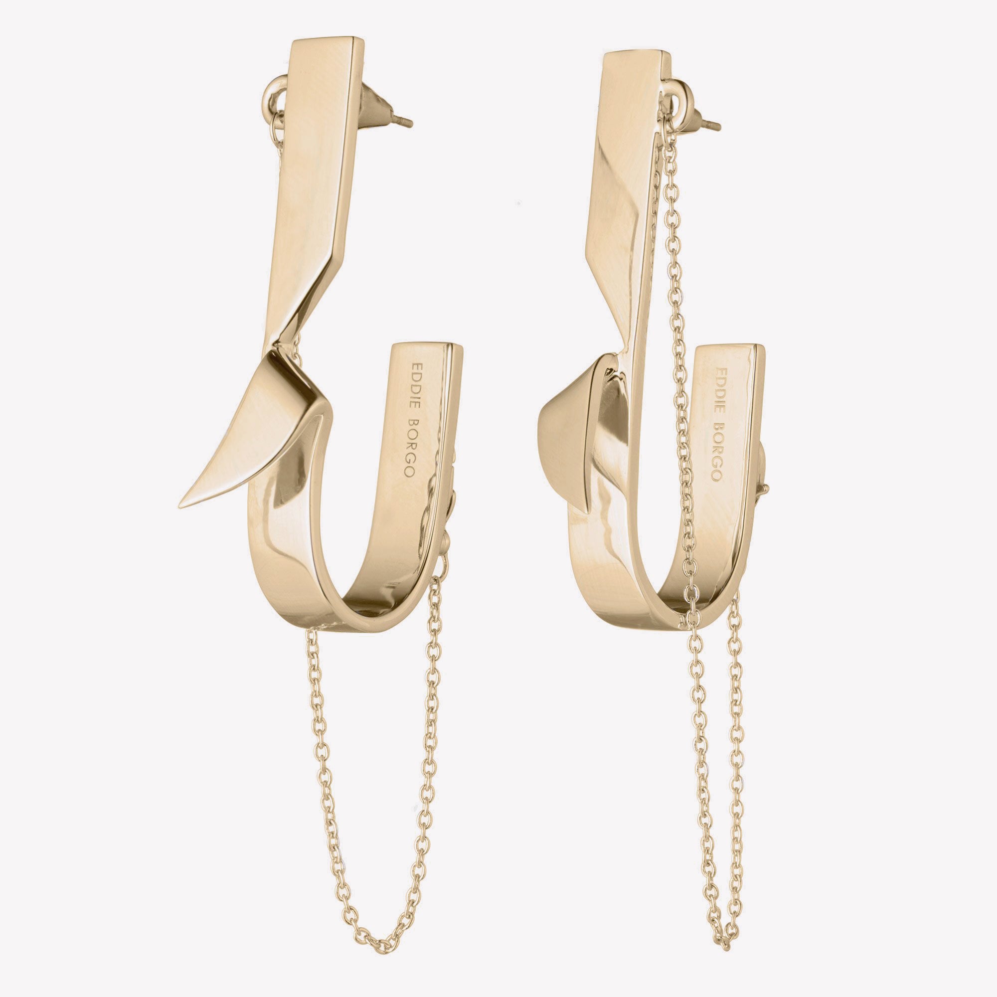 Juxtaposing structured form with fluidity, the Folded Hoop Earrings, finished in 12 Karat Gold, give new dimension to a classic oval hoop style by showcasing the elegant fluidity of folded metal. Created by hand, these unique earrings were first finished as a simple band, the fold was then hand hammered to create the draped effect. A delicate cable chain drapes over the the exterior of each piece. Secure with a custom Eddie Borgo earring back. Surgical steel posts, for pierced ears.