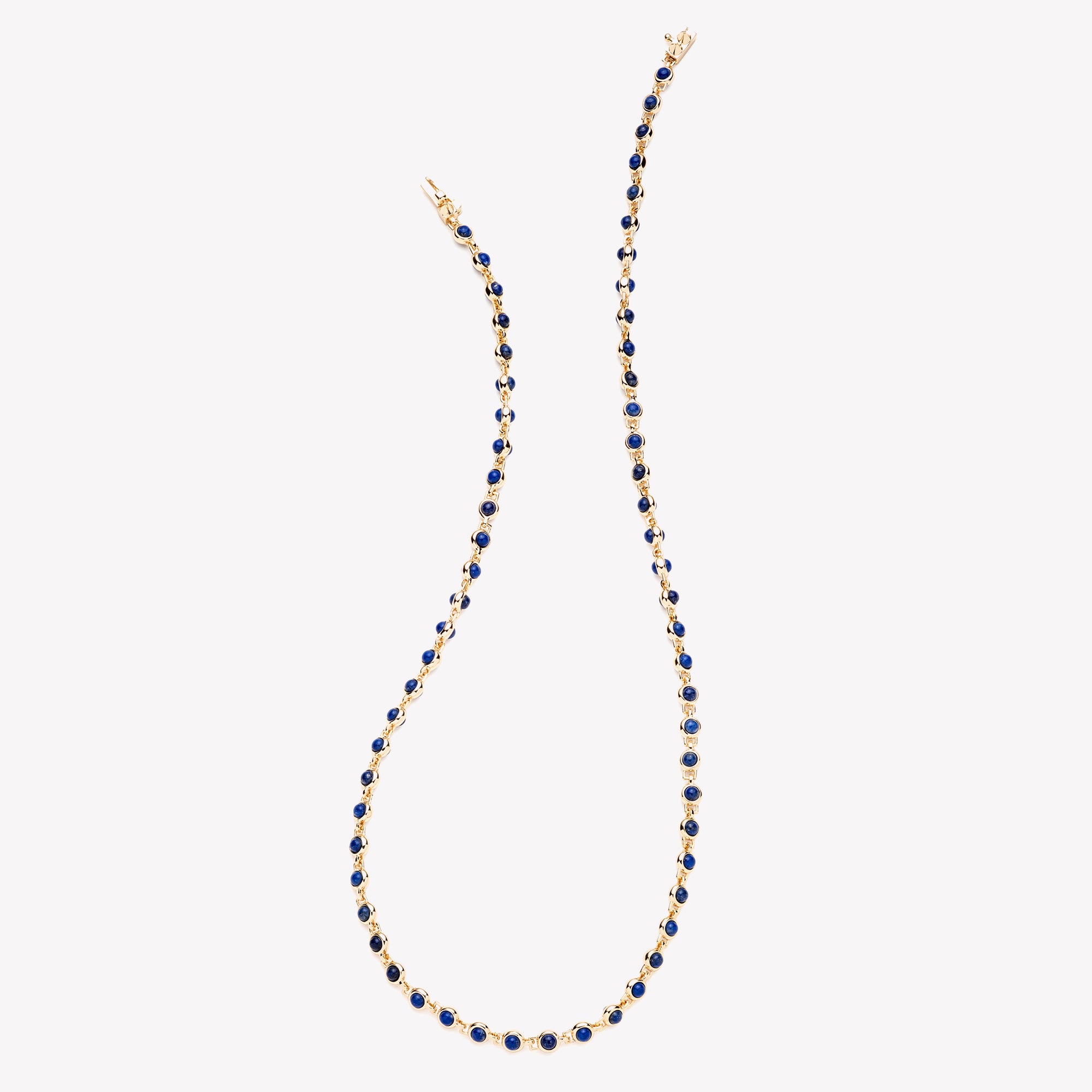 The Short Inlaid Dome Necklace, finished in 12 Karat Gold, is a classic link necklace, composed of individually channel set cabochons of genuine Lapis Lazuli, intricately linked together with our trademark hinge work. Each piece contains over 100 hand cut Lapis Lazuli cabochon stones. Close at the back with a custom box closure and secure with a safety latch.