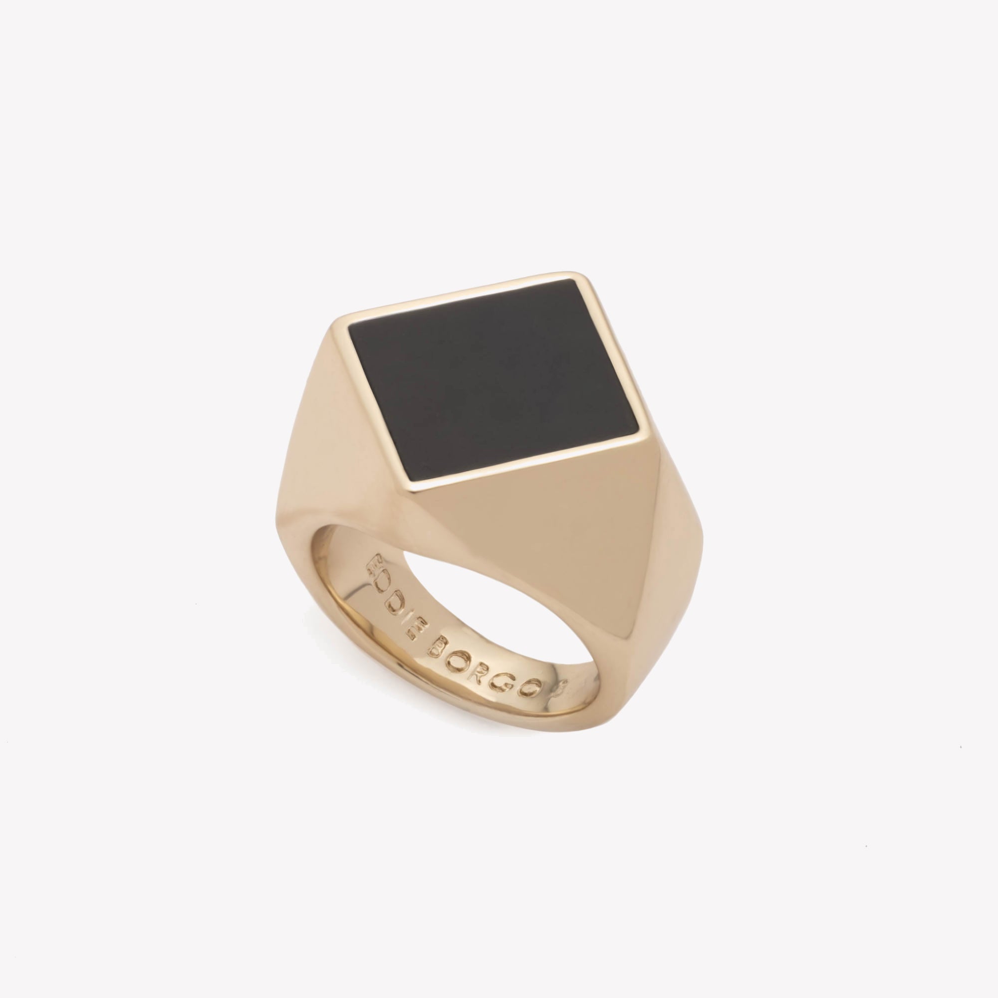 The Inlaid Square Signet Ring, finished in 12 Karat Gold, is a classic, bias-set square signet ring. This unique piece has been inlaid with a hand carved square slice of black Onyx and set into a faceted, gold base. This ring can be worn as an everyday signature.