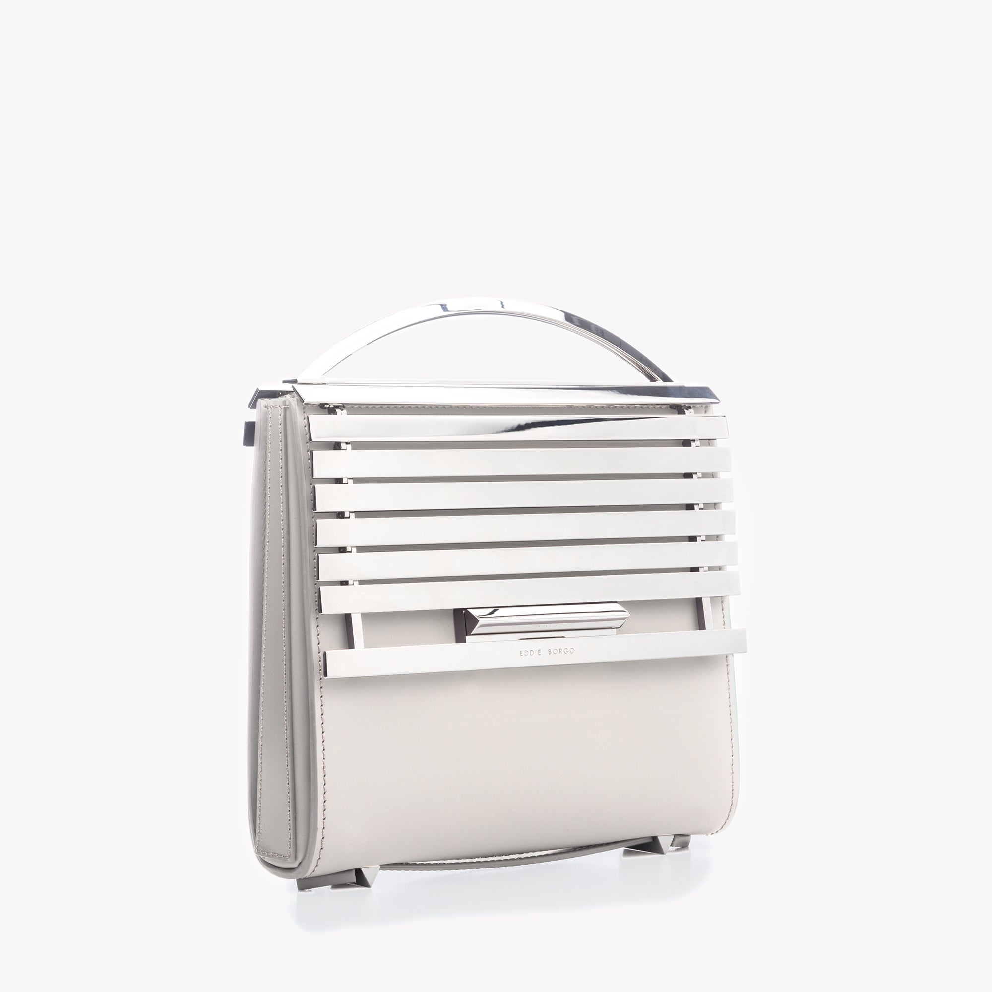 The Colt Crossbody in Matte White Calfskin features an architectural, expandable body and a geometric Sterling Silver vermeiled fold over flap with top handle. This inimitable handbag has been created by hand, in Italy, and opened by gently pushing down on the central crossbar. Inside, there are slip pockets for your cellphone and lipstick, as well as a zipper pocket.