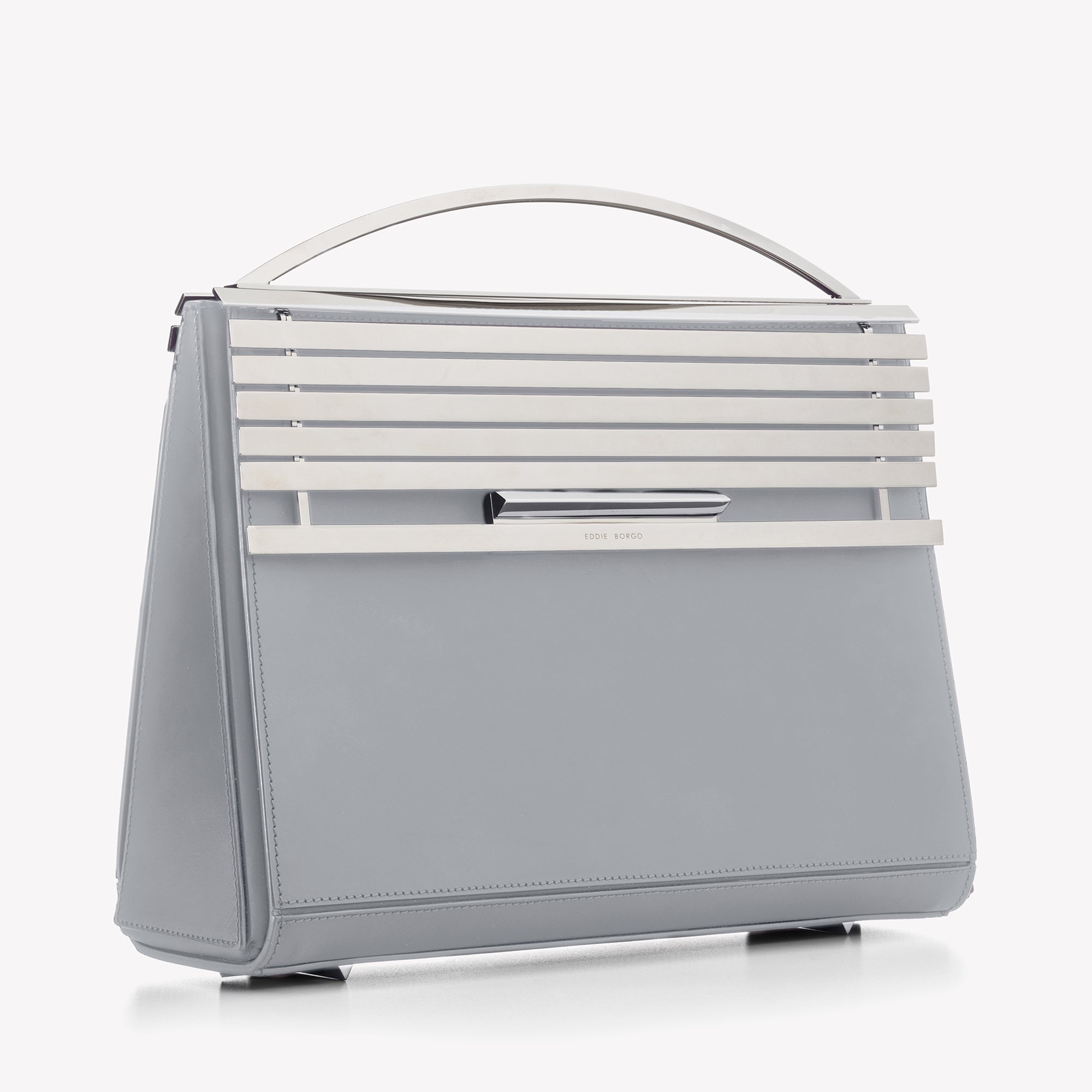 The Colt Satchel in Matte Dove Grey Calfskin features an architectural, expandable body and a geometric Sterling Silver vermeiled fold over flap with top handle. This inimitable handbag has been created by hand, in Italy, and opened by gently pushing down on the central crossbar. Inside, there are slip pockets for your cellphone and lipstick, as well as a zipper pocket.