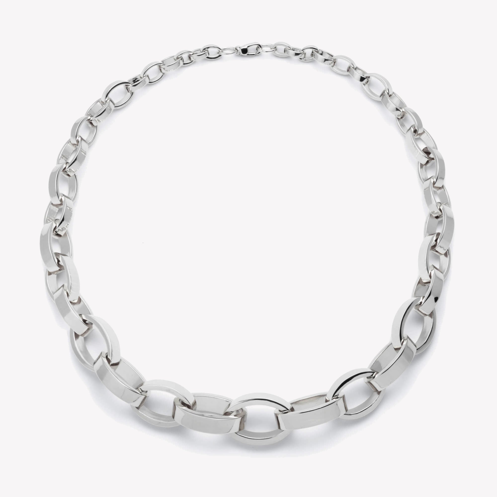 The Graduated Ellipse Link Necklace, finished in Silver, is a hand forged composition of delicate oval looped links, in a gradation of seven different sizes. This unique heritage link necklace is a timeless staple. A custom clip closes the piece securely around the neck.
