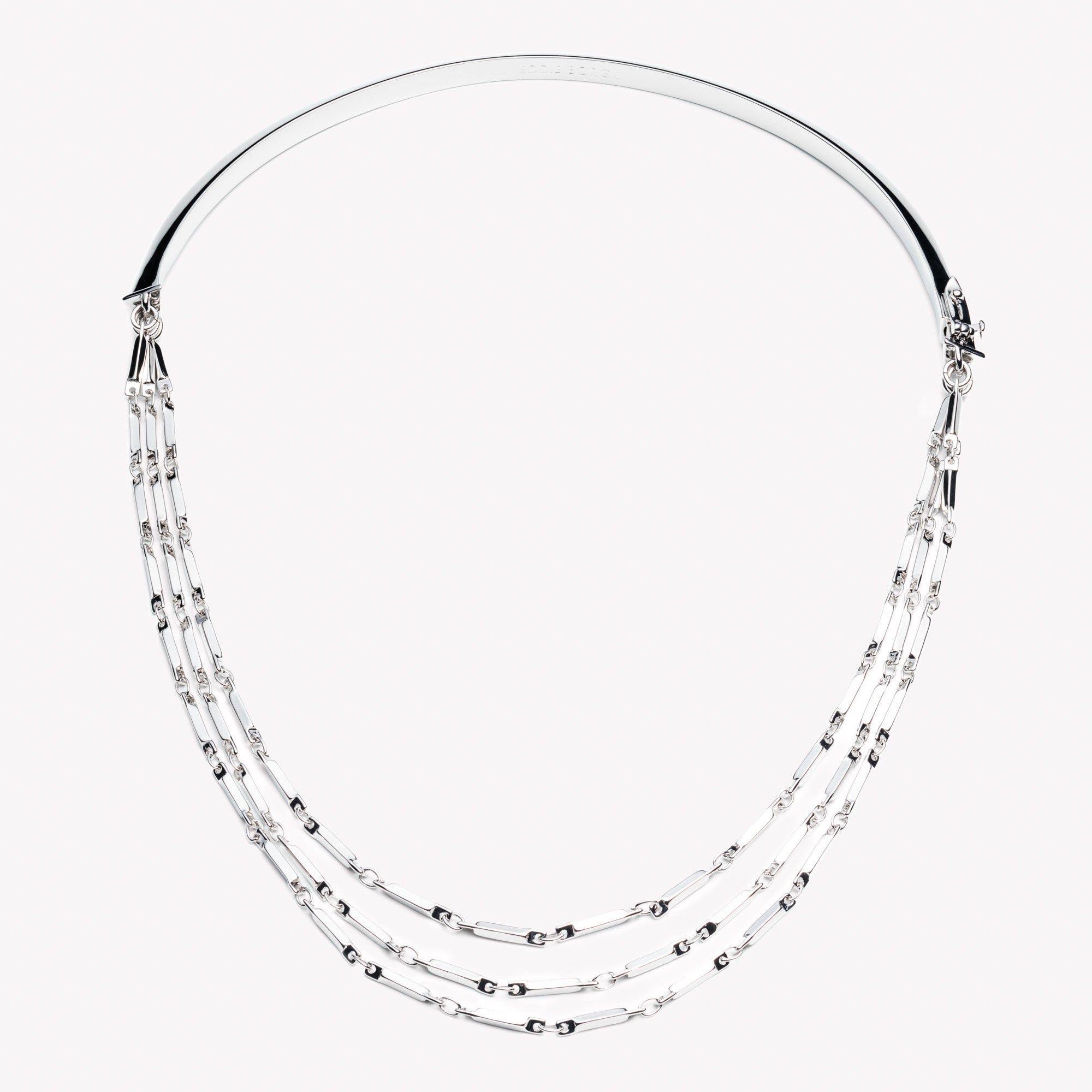 The Peaked Chain Necklace, finished IN SILVER, IS A UNIQUE LAYERED BAR CHAIN NECKLACE; THE CHAIN DRAPED FROM A BACK BAR THAT RESTS ON THE NECK FOR COMFORT. EASILY OPENS AT ONE SIDE WITH A CUSTOM BOX CLOSURE AND SECURES WITH A SAFETY LATCH.