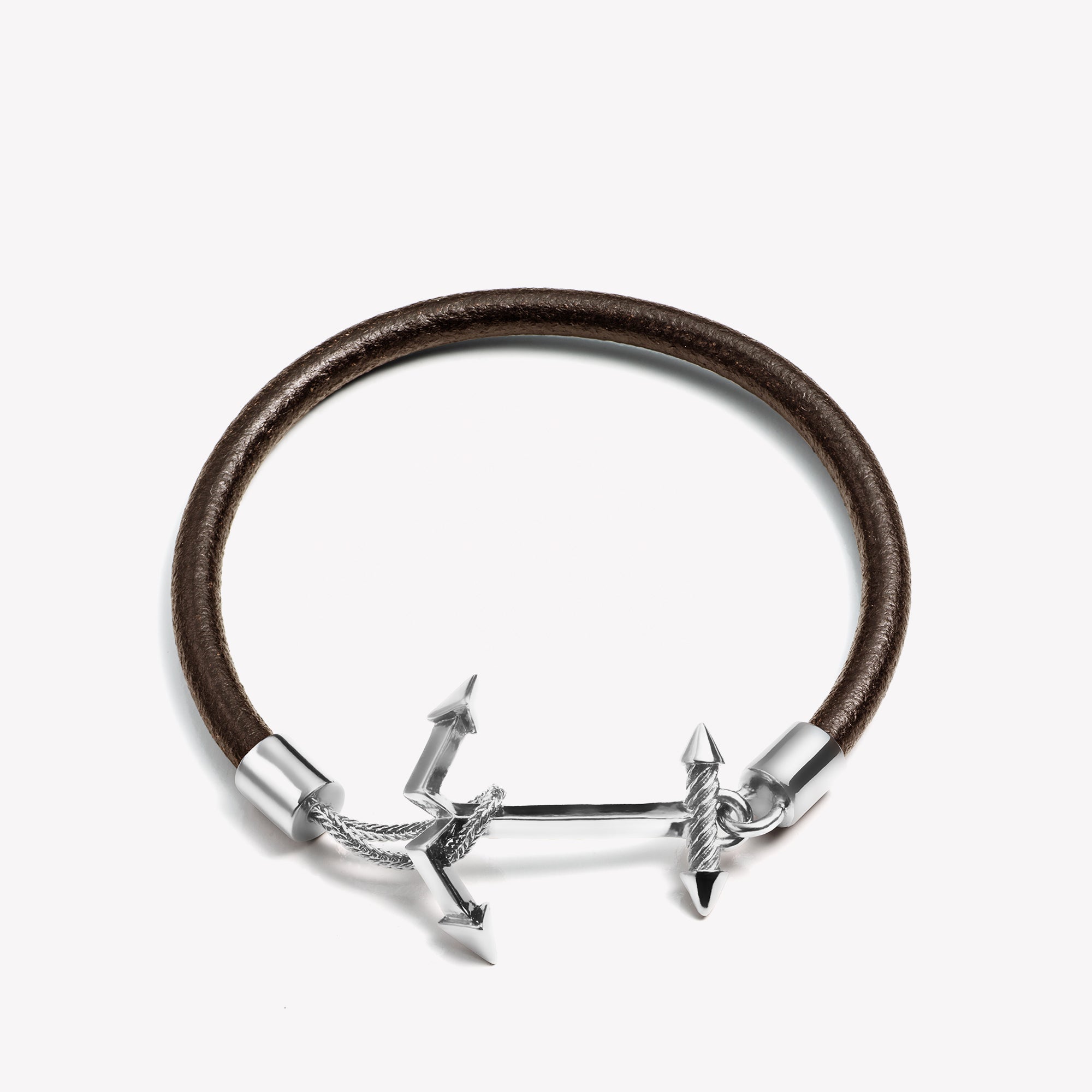 THE MEN'S ANCHOR BRACELET IN STERLING SILVER HAS BEEN FINISHED IN MATTE. THE CENTRAL ANCHOR SHAPE HAS BEEN CREATED BY HAND, MOLDING FACETED BARS, AND TOPPED WITH A TWISTED CABLE WIRE. CAREFULLY CONNECTED TO A PLIABLE, SOFT, CHOCOLATE BROWN CALF LEATHER TUBE. SECURES BY WRAPPING THE HAND MADE TOGGLE CHAIN AROUND THE BASE OF THE ANCHOR.