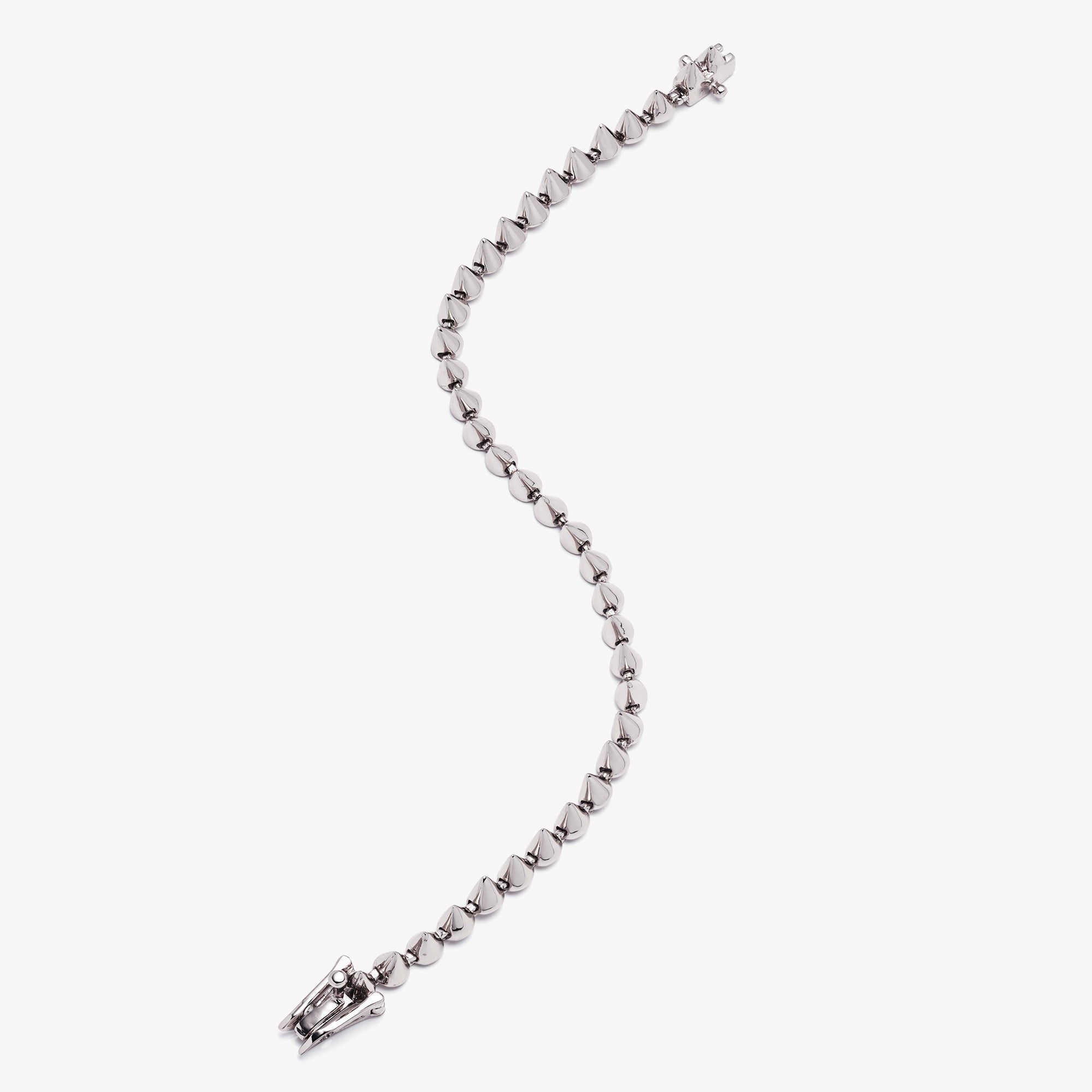 The Cone Tennis Bracelet, finished in silver, is our signature tennis bracelet, composed of delicate cone shapes joined together by hand with individual hinges. A signature Eddie Borgo piece, wear the cone tennis bracelet alone or alongside your other cone bracelets. Close with a box and tongue clasp and secure with two safety latches.