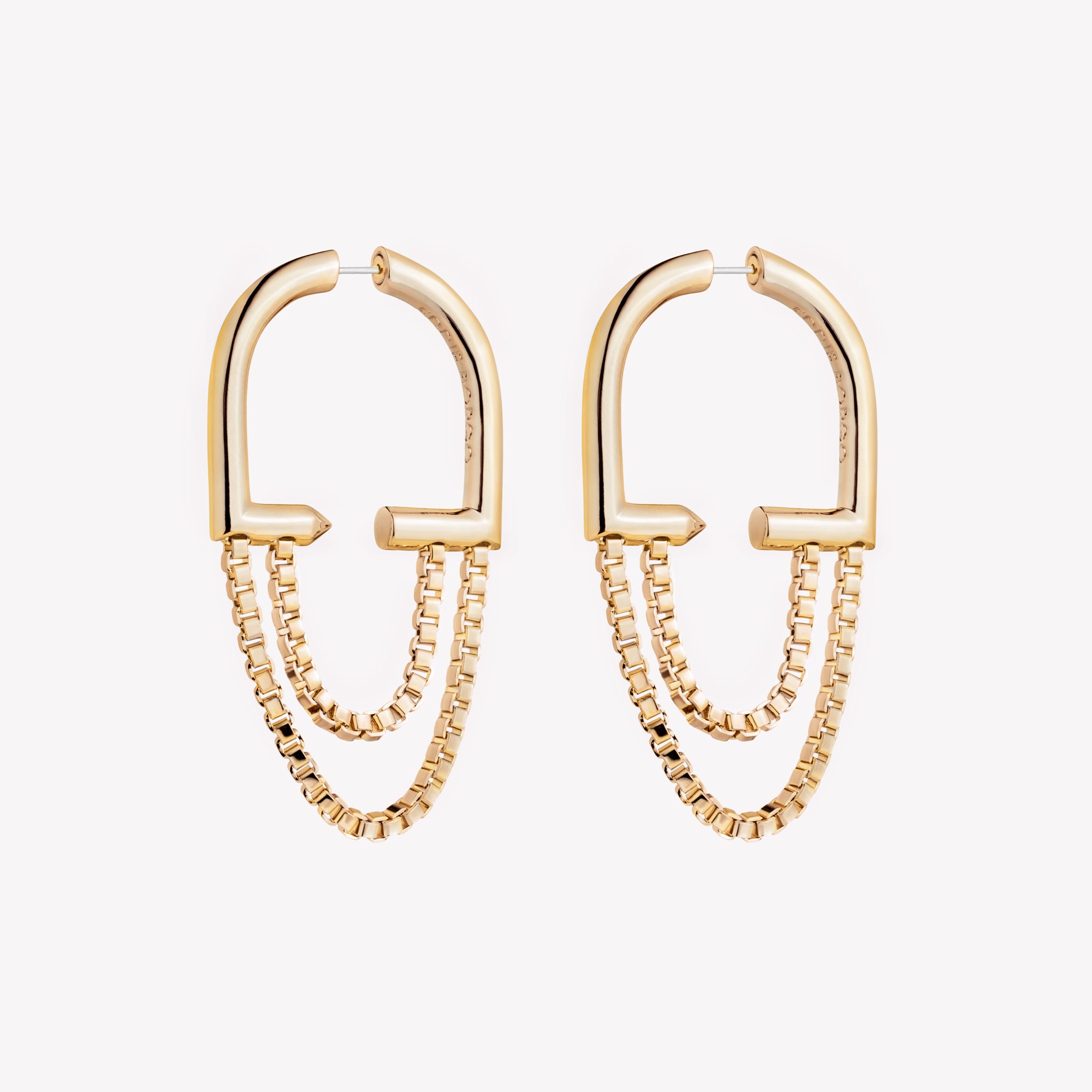 The Allure Chain Hoops, finished in 12 Karat Gold, are seamless hoop earrings, created with two hand formed bars, draped with delicate box chain. The earring opens by lightly pulling on the bars to separate the two sides.