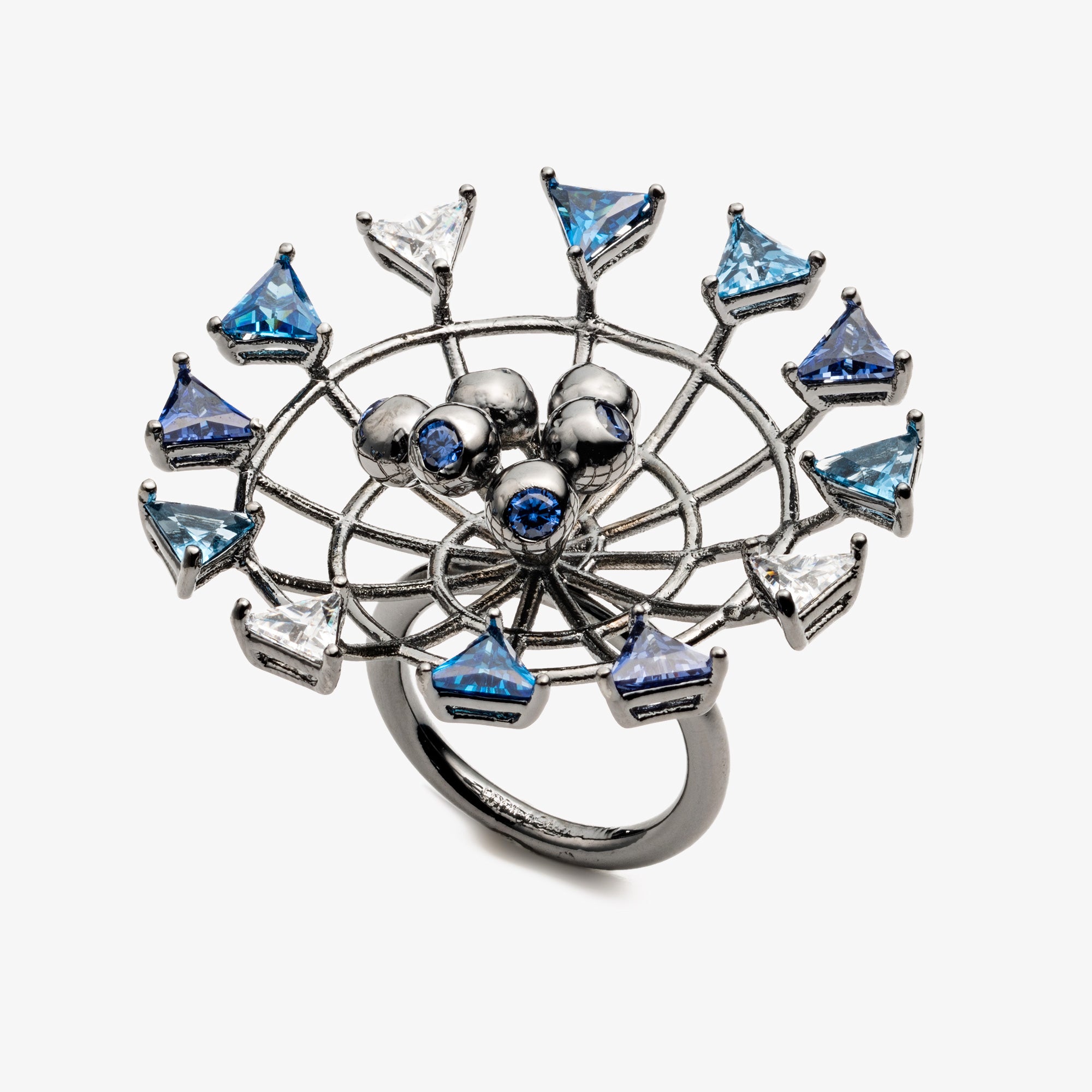 The Apollo Ring, finished in blackened silver, is a unique cocktail ring, built from a hand forged system of spiraled wire to resemble a spiral galaxy. Hand cut crystals of Aquamarine, crystal, Sapphire, and Amethyst surround a cluster of orbs inset with delicate sapphire crystals.