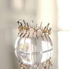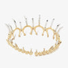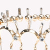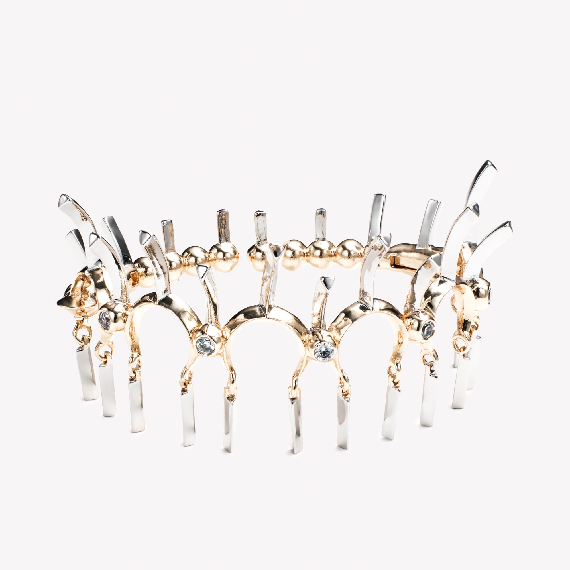 The Arched Sibyl Cuff, finished in a combination of both 12 karat Gold and Silver, has been created by hand, joining fine crescent moon shapes together with arched accents and delicate fringe. At each point of connection, a delicate hand cut crystal has been set into the bracelet for subtle sparkle. This unique cuff opens with two custom hinges at each side, simply pull open the bracelet to slip onto the wrist.